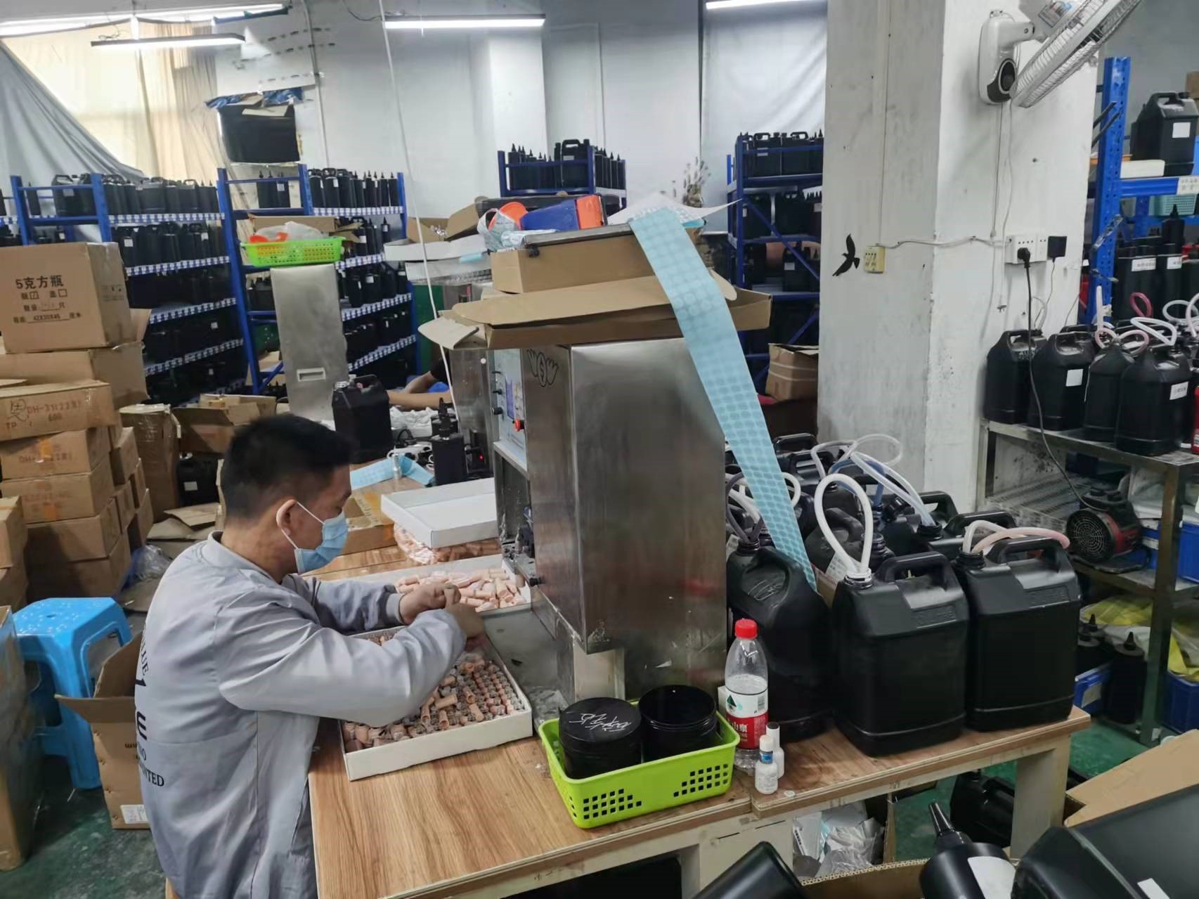 执法人员再次对这两家公司进行全面排查,发现其除了注册登记的地址外,还租有别的仓库,便立即对两个仓库开展突击执法检查。执法人员推开仓库的大门,映入眼帘的是一个小型加工厂,里面摆放着各种甲油胶成品、半成品原料及生产设备,工人正在灌装甲油胶。