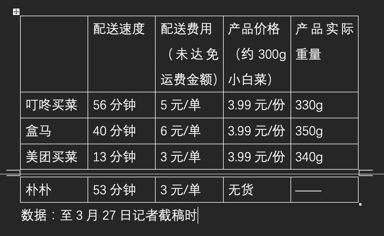27日上午,记者在盒马、美团买菜、叮咚买菜以及朴朴App下单买菜。蔬菜品类选择方面,记者选择较为普遍的小白菜。分别在盒马、美团买菜以及叮咚买菜App搜索小白菜,均有相关产品显示,据页面显示,三家App的小白菜售价是3.99元/份,每份重量约为300g。