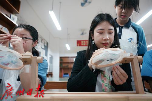 2022年3月22日,广绣传承人梁晓曼(前右)指导同学们学习广绣技艺。