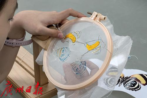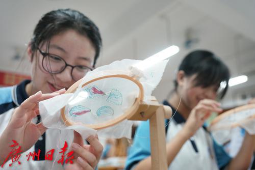 广绣作为中国四大名绣之一,具有浓郁的岭南特色,其构图饱满、色泽富丽,一针一线中都能窥见匠人精神!在广州市天河外国语学校,每周二都有广绣非遗课程,学生在广绣传承人梁晓曼的指导下,用一双双巧手,穿针引线,在布面上绘出一幅幅灵动的广绣。目前,天河外国语学校美术科组研究发展出“广绣与扎染创新融合”特色项目,致力于将广绣针法和扎染肌理有机融合,创新发展广绣技艺,传承岭南传统文化。