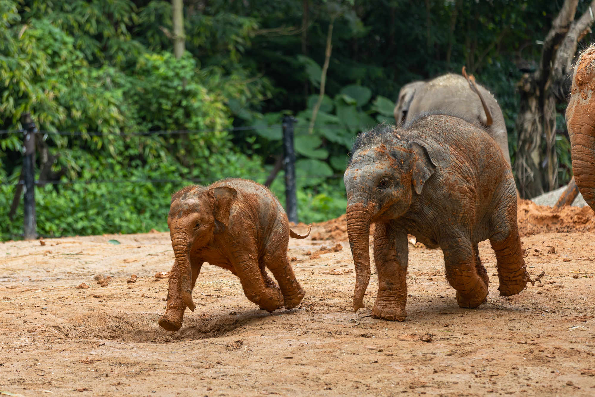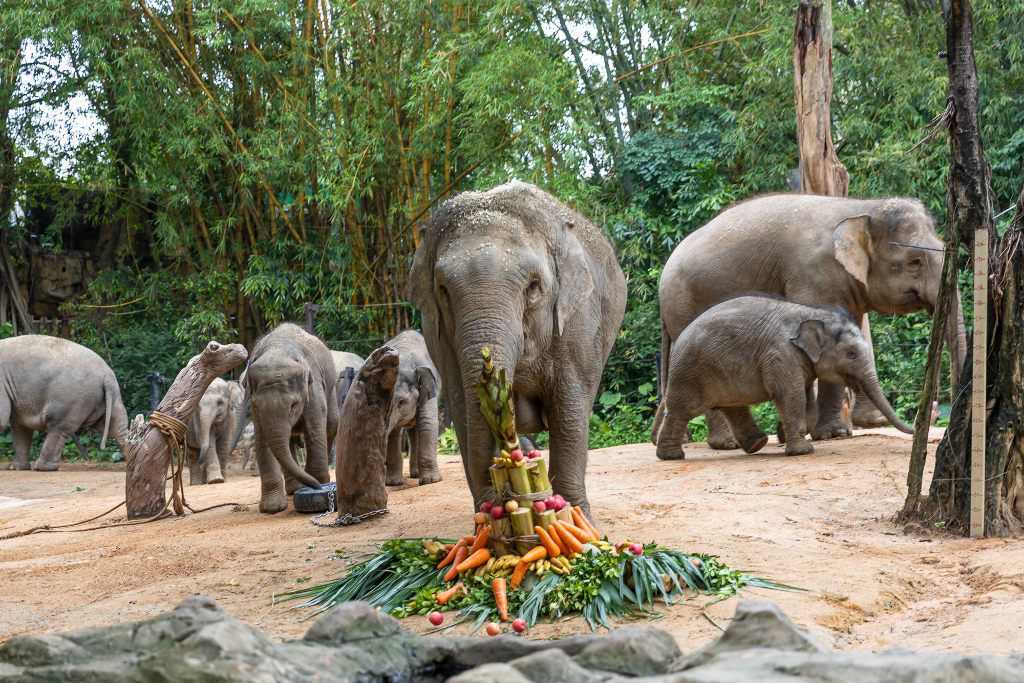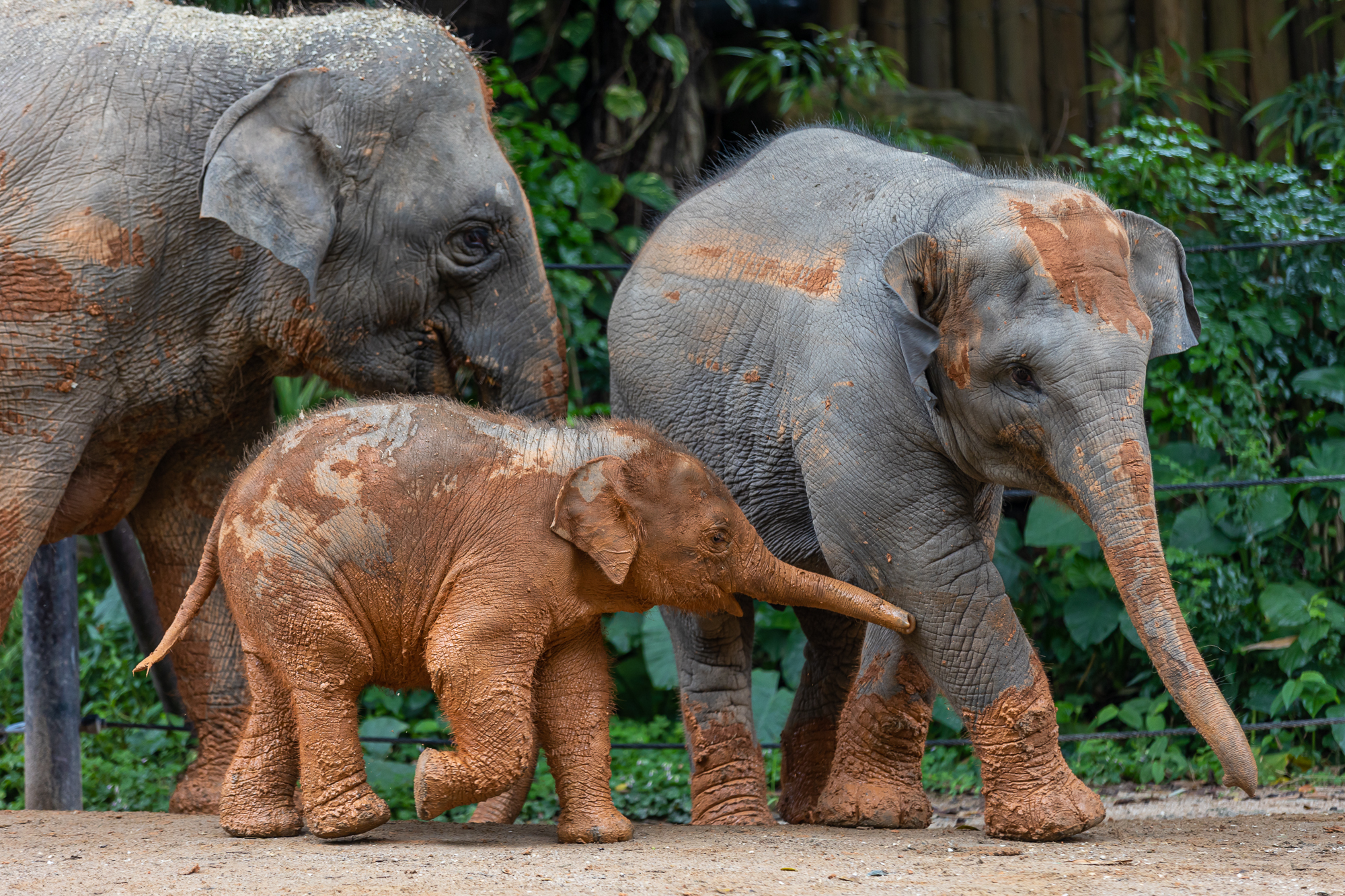 在亚洲象园里,大象妈妈领着活泼可爱的小象宝宝们漫步而出,和“长辈们”比起来,小象们的个头不高,却以活泼可爱的个性成为全场焦点。“泳池”边,它们纷纷用鼻子喷洒水,在用长长的鼻子卷起红萝卜、香蕉等美食,大快朵颐,还调皮地跑进黄泥“澡盆”里玩泥沙,开心时还不断发出响亮的叫声,吸引了全场关注。