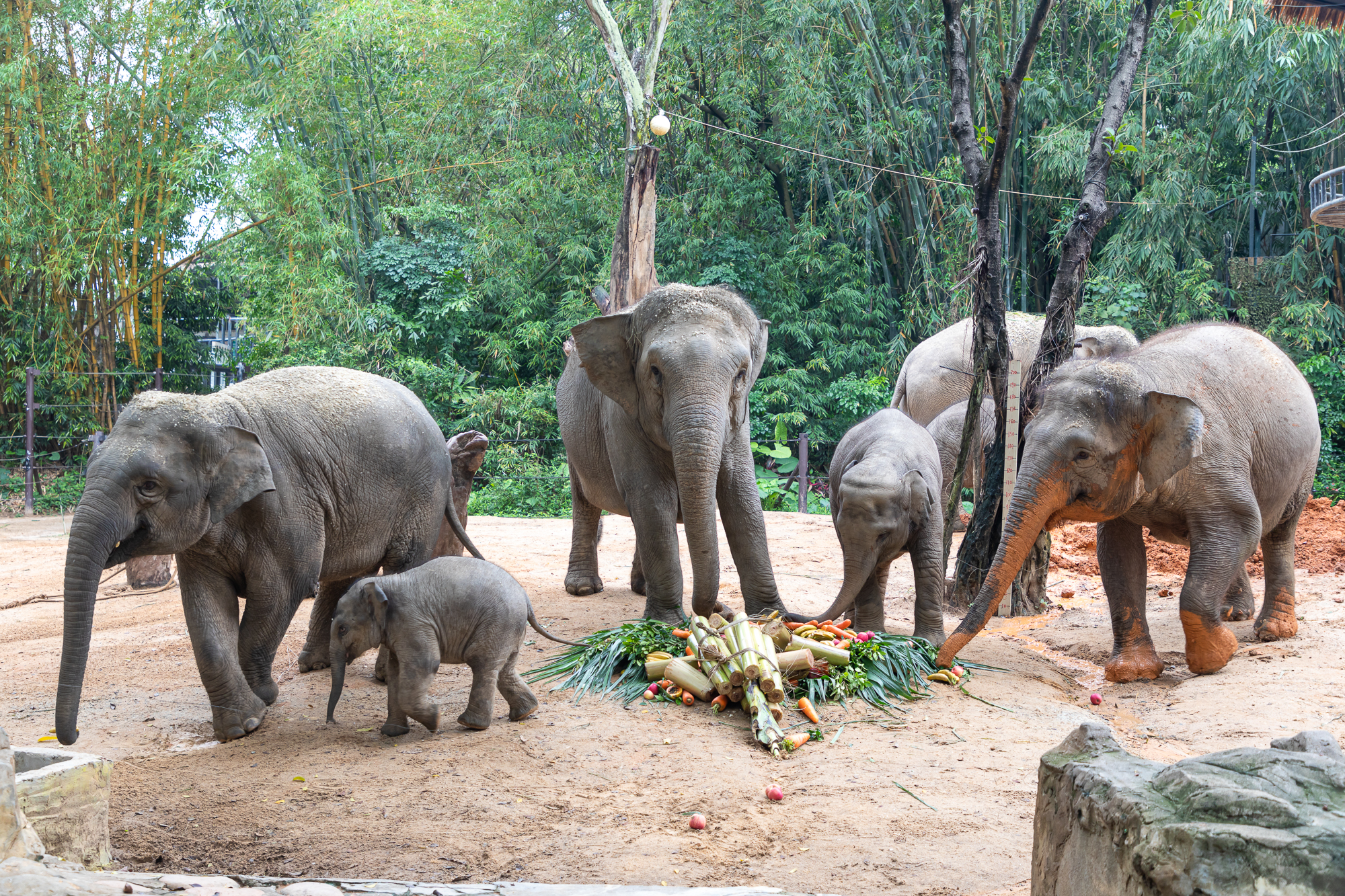 目前,园区共养育有30多头亚洲象,其中十多头是近年来在广州成功繁育的。为了亚洲象们住得更舒适、更天然,保育员们特地在 “象房”的地面铺设了厚实的“床垫”,还为亚洲象们准备了黄泥水“澡盆”,让它们随时滋润皮肤。对于新生的象宝宝,保育团队更是照顾有加,几乎24小时不间断照顾它们的起居饮食。