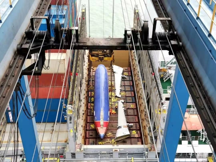 通过各作业环节的有效沟通、充分准备、团结协作,3月26日中午12:10,作业人员仅用时1小时安全卸下飞机机身,12:30完成对飞机机身的绑扎加固;13:35完成两个飞机机翼的接卸任务,13:55完成对机翼的绑扎加固任务,稳稳当当地把客机卸下船并装上拖挂车,安全高效地完成了本次接卸任务。