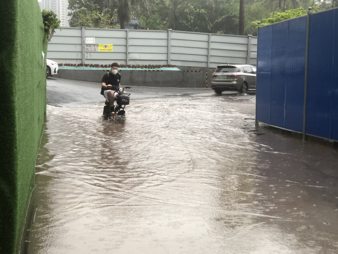 3月26日,受雷雨影响,荔湾区白鹤洞街曼宁社区部分地势较低的地方出现了水浸街,给市民的出行造成不便。