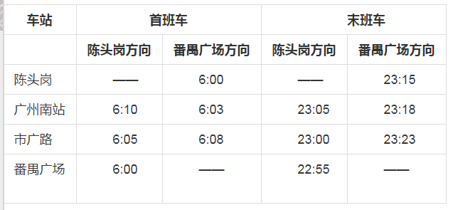 22号线首通段西起陈头岗,东至番禺广场,全长18.2公里,共设4座车站,均为地下站。线路从陈头岗出发,途经广州南站、市广路站、番禺广场站,其中广州南站(可换乘2号线、7号线、佛山地铁2号线)、番禺广场站(可换乘3号线、18号线)为换乘站,乘客可按照换乘导向指引进行换乘。开通初期,22号线首通段运行最高速度为160公里/小时,单程用时约14分钟,行车间隔约7分30秒。