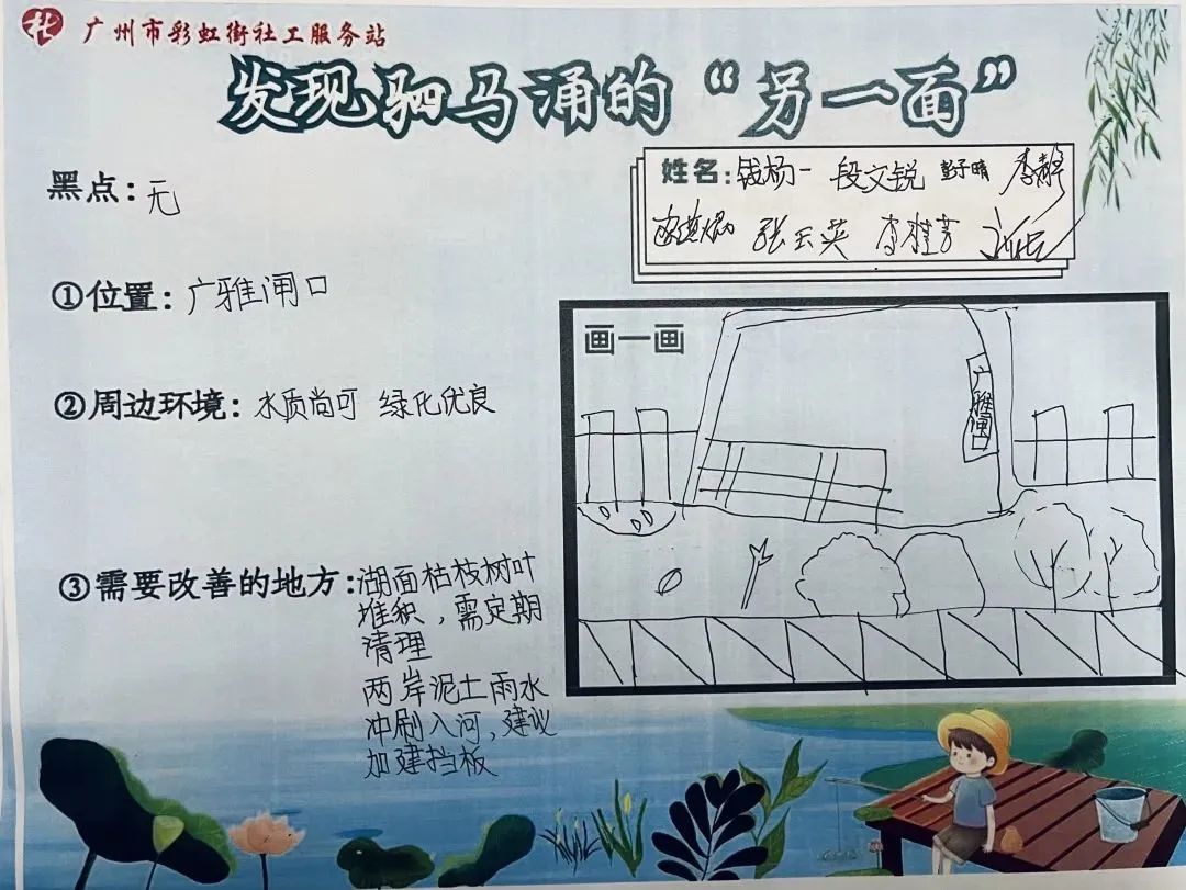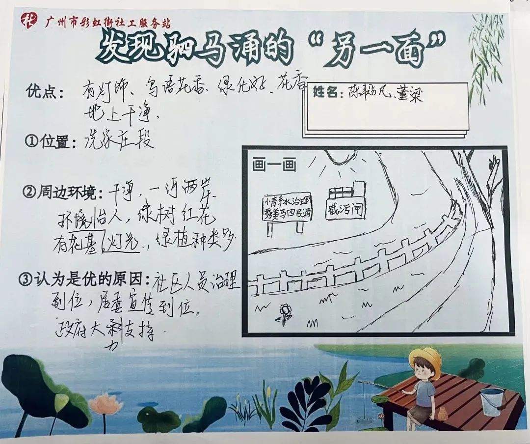在巡护过程中,来自西华路小学的孩子们在任务卡上记录河涌环境的优点,绘制驷马涌印象图,并提出了治理河涌的小建议。