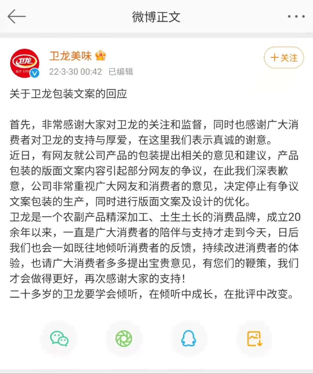 3月30日凌晨,针对近期卫龙辣条包装被指打低俗擦边球一事,卫龙通过官方微博“卫龙美味”回应称,有网友就公司产品的包装提出相关的意见和建议,产品包装的版面文案内容引起部分网友的争议,在此公司深表歉意,公司非常重视广大网友和消费者的意见,决定停止有争议文案包装的生产,同时进行版面文案及设计的优化。