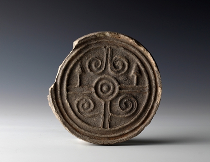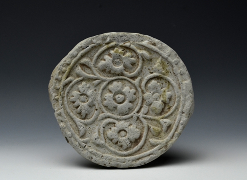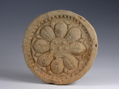 泥质灰陶,质地较软。当心莲房为一圆形凸台,内饰8颗莲子,莲房外绕8个复瓣宝装莲花,向外分别饰一周弦纹、联珠纹、卷草纹、弦纹和联珠纹等。