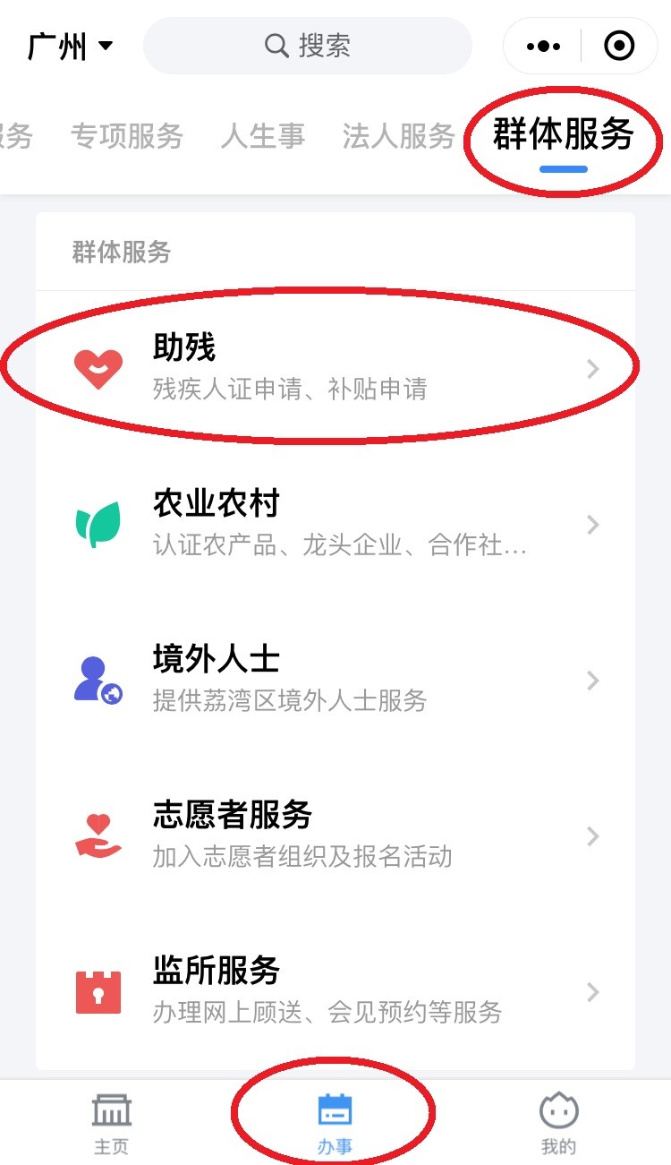 1.微信搜索登录粤省事小程序,点击“办事”页—“群体服务”—“助残”—“残疾人两项补贴申请”。