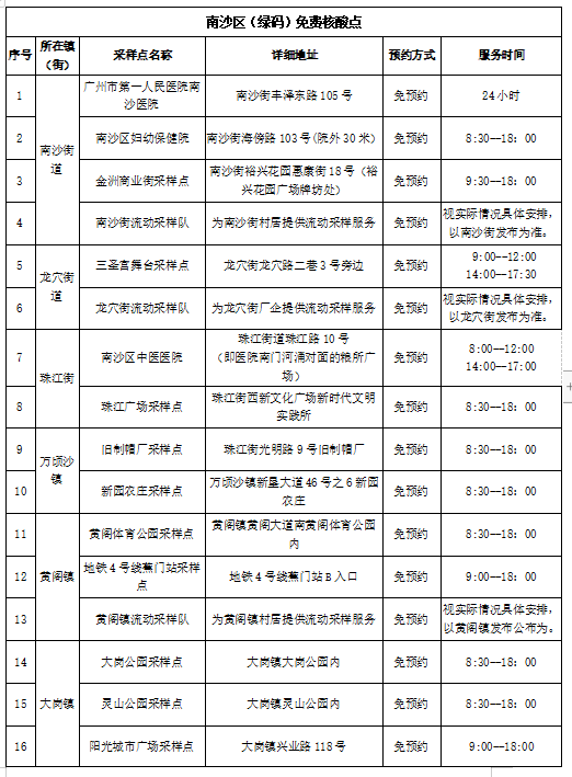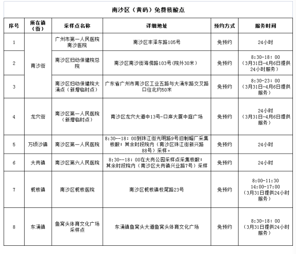 记者今天从南沙区卫健局获悉,南沙黄码免费核酸点信息有更新。新增点为南沙街:南沙区妇幼保健院大涌点(新增临时点)、龙穴街:南沙区第一人民医院(新增临时点),有需要的市民请就近前往。