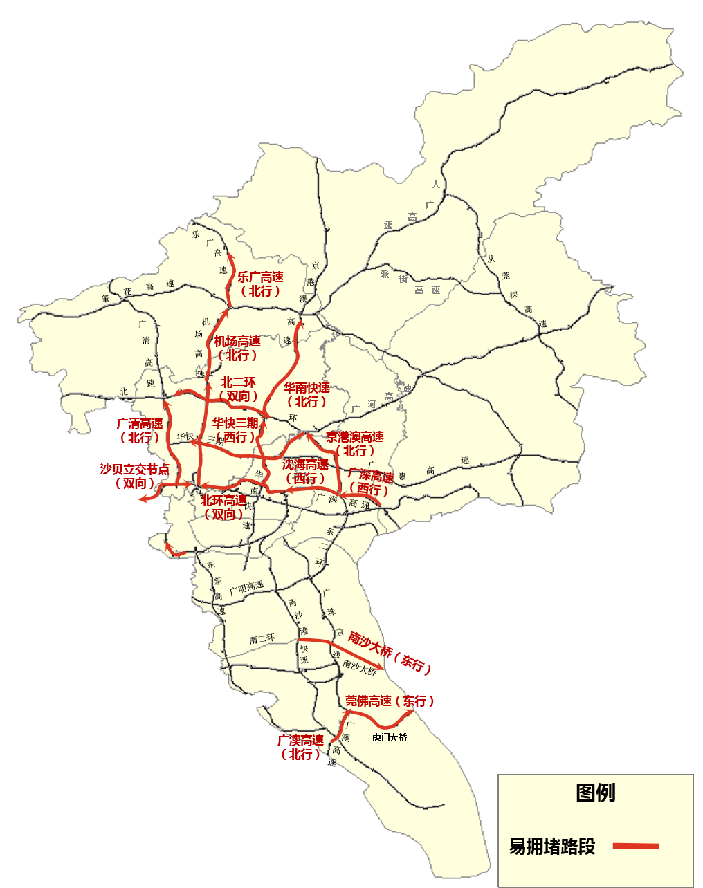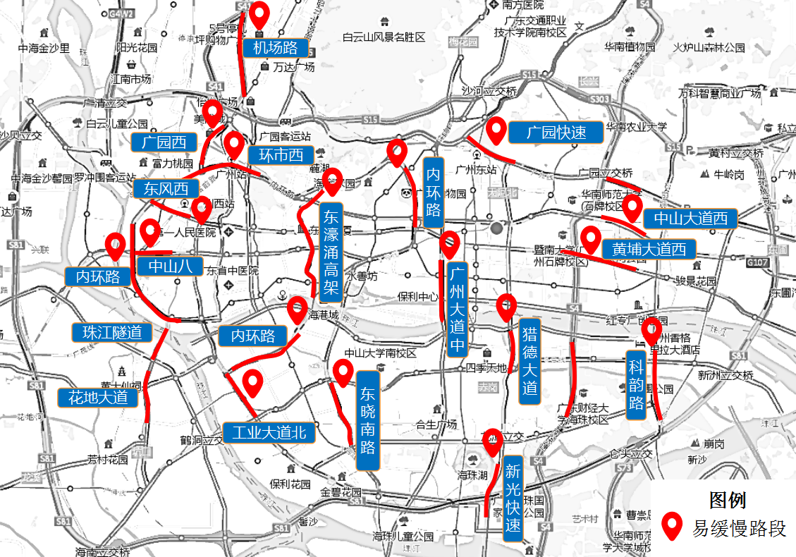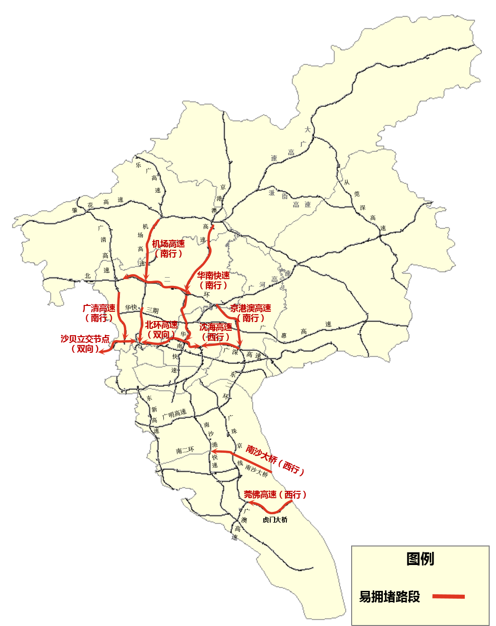 路段方面,易缓慢路段为机场高速(三元里—蚌湖立交段)、华南快速路(春岗立交—太和立交段)、乐广高速(花山互通立交—花山隧道段)、北三环(机场北立交—杨荷立交)、广清高速(广清立交—朝阳立交段)、沈海高速(蚌湖立交—和顺立交段)、南二环(鱼窝头立交—张松立交段)等瓶颈路段。同时,北环高速沙贝服务区、横沙服务区、京港澳高速瓦窑岗服务区、广河高速正果服务区、大广高速从化服务区、乐广高速花城服务区、北二环高速火村服务区及北三环新安服务区等高速服务区,在高峰时段易出现车流密集,车辆进入服务区排队时间较长。