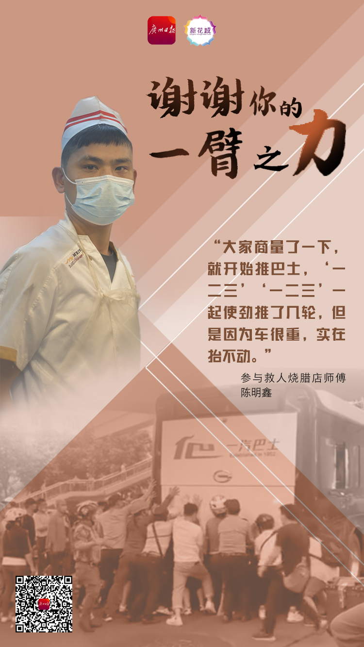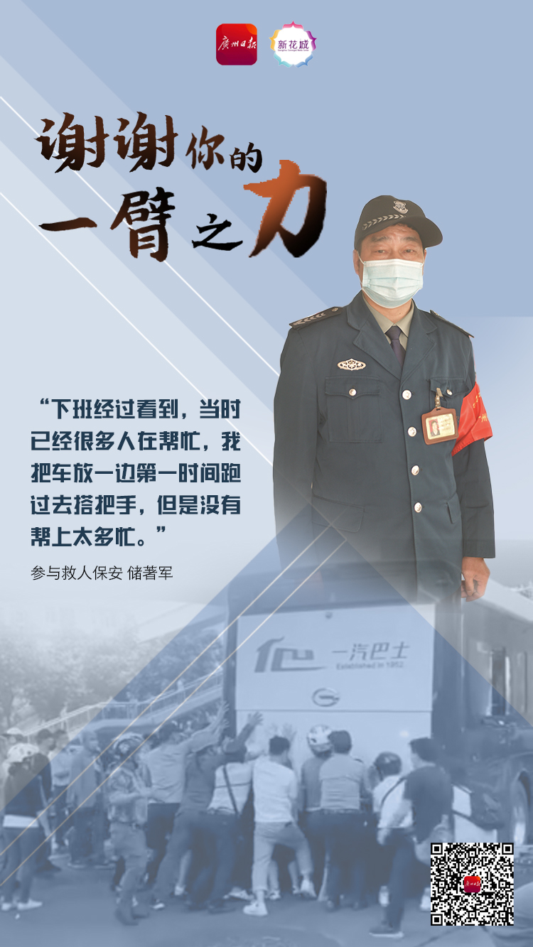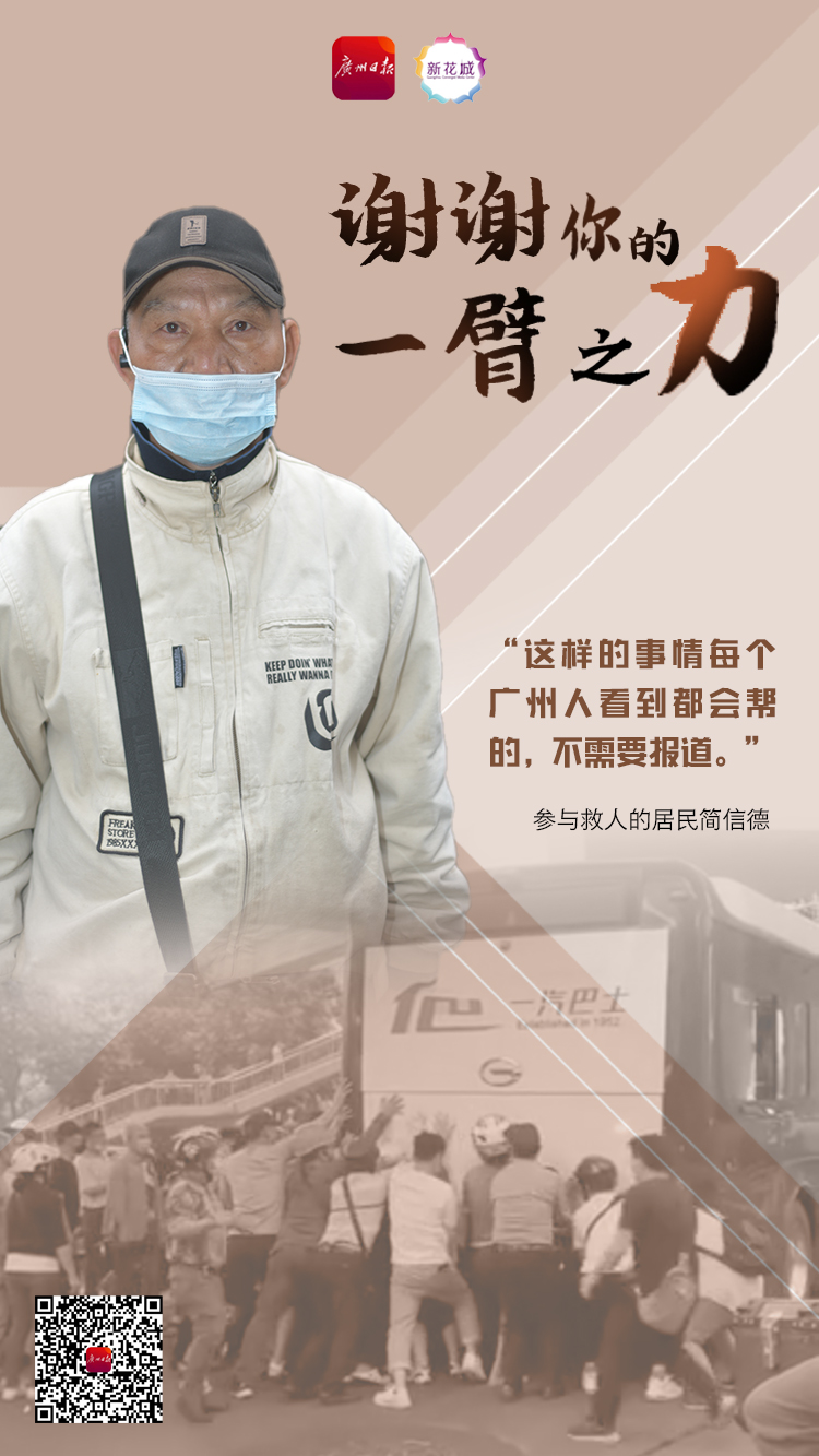 广州日报迅速发起“寻找伸出一臂的你”全城搜寻活动,寻找参与现场救援的市民。经过一天的努力,寻获5位救人市民。他们中,有环卫工人,有保安,有烧腊店店员,有热心老街坊……平凡的人,在危难来临时做出一致的选择:救人!