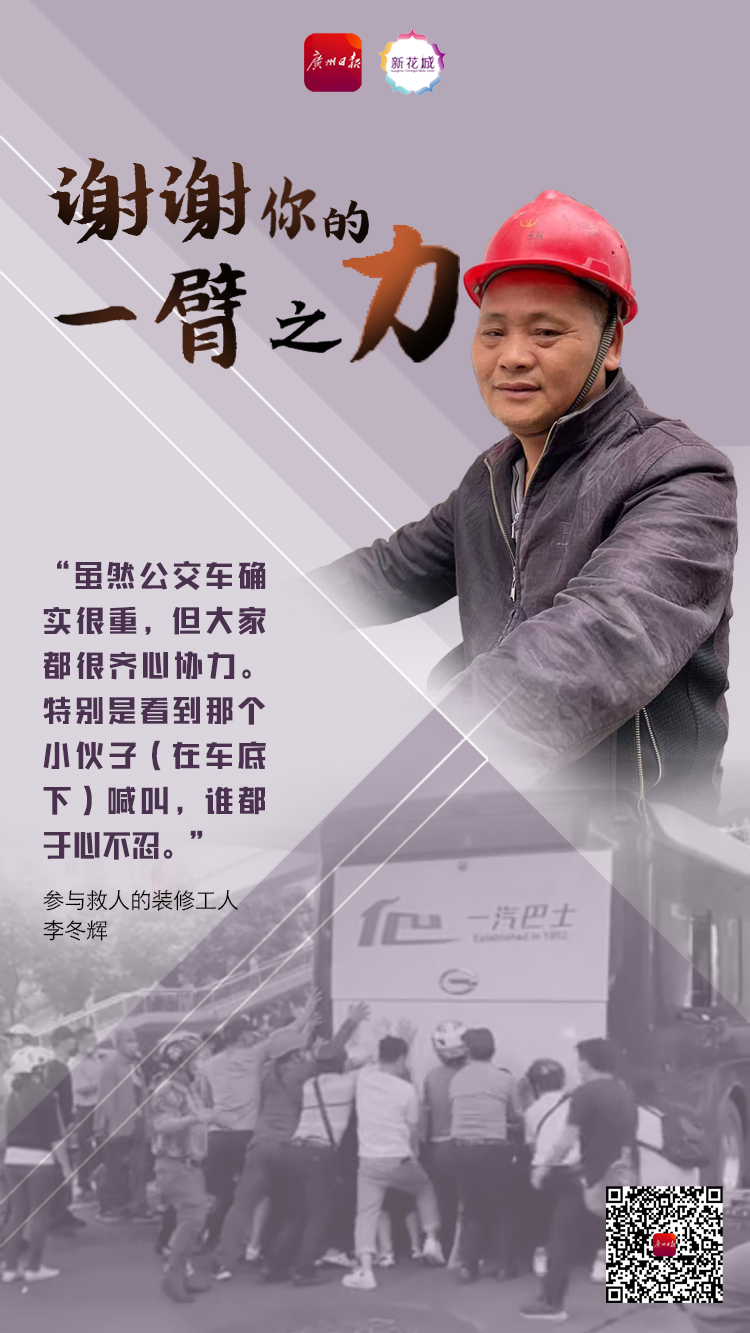 李冬辉是湖南人,1987年他便从老家来到广州打工,如今他是一名装修工人。31日晚上,刚骑上电动车准备回家的李冬辉看到众人在抬公交车,他便和同事刘志富一同加入抬车的前排队伍中。因为救人心切,李冬辉用尽了全身的力气,他身上的衣服也几乎湿透,小拇指甚至不慎被车压伤,“虽然公交车确实很重,但大家都很齐心协力。特别是看到那个小伙子在(车底下)喊叫,谁都于心不忍。”