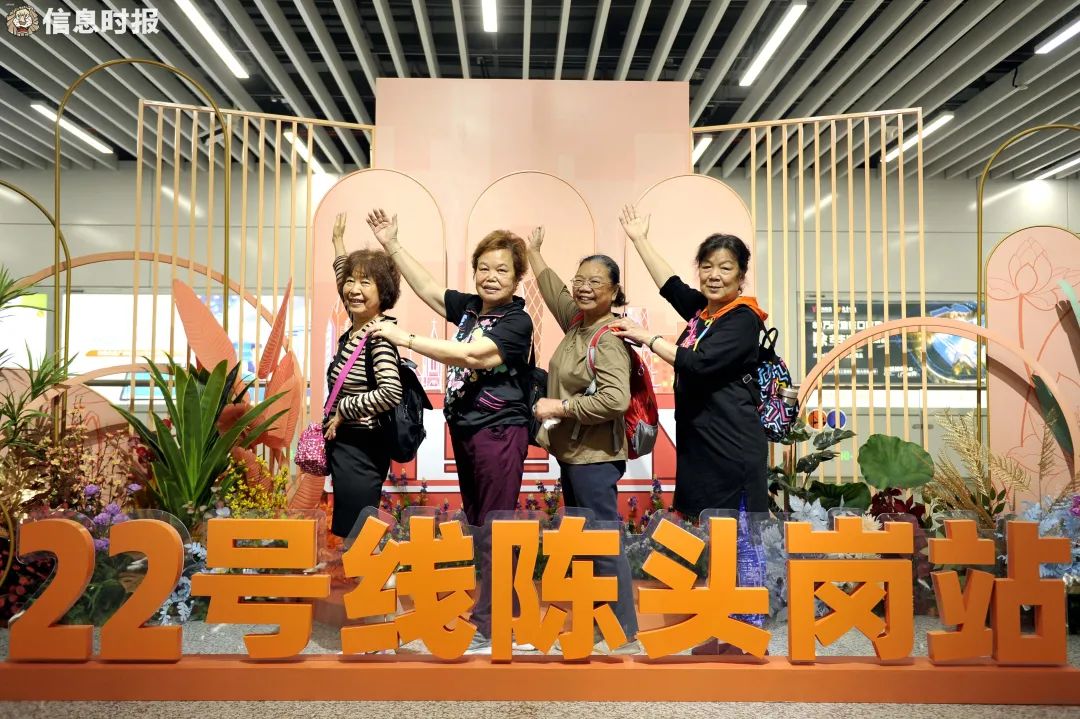 在陈头岗站中央,许多市民围绕着打卡点和花卉景观拍照留念,张叔也是其中一员。张叔激动地说道:“我们是祈福新邨的居民,一直盼望着22号线可以快点开通。昨天看到消息,我们真的很开心。”