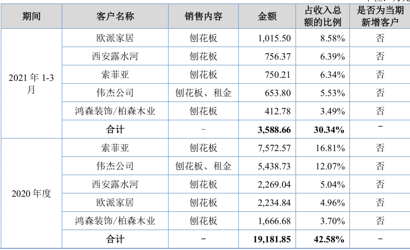 根据鼎丰股份此前发布的《向不特定合格投资者公开发行股票说明书(申报稿)》,2018年以来,公司前五大客户包括欧派家居、索菲亚国内知名的家居上市公司。2021年1-3月,对欧派家居和索菲亚销售刨花板金额分别为1015.5万元、750.21万元,占收入总额的比例分别达8.58%、6.34%,分别为第一、第三大客户。