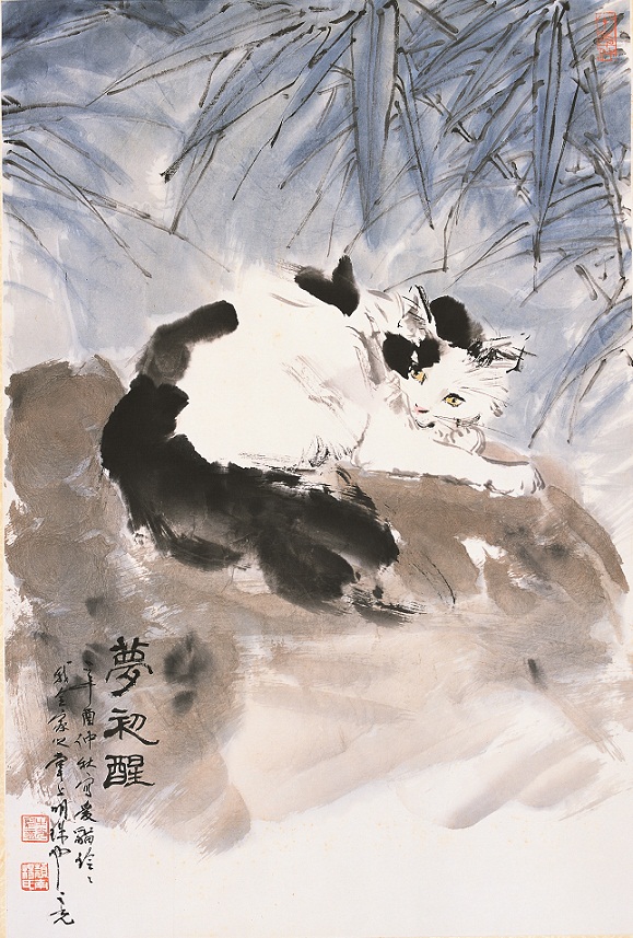 在展览中我们可以感受到画家们细致入微地刻画,对于丝毛技巧灵活的掌控,以及对层次渲染的熟练应用。许多画家将毛发描绘得蓬松有致,丝毫毕现,如赵少昂的《草泽雄风图》、何香凝(1878-1972)的《狮子》等。也有部分画家采用没骨手法,通过墨色的塑造或是渗发呈现出了虚实有致,浓淡相宜的效果,如任颐(1840年-1895)的《猫图》、杨之光的《梦初醒》等。在走兽画在技法表现上,我们可以发现他们互通互鉴的地方,比如虎、狮、猫在毛色、动作姿态的描绘上,些许有规律可循。对于“神”与“形”把握我们也可以借机展开一次讨论。