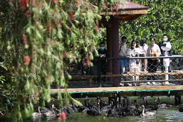动物园内花红柳绿,动物们活泼可爱,一派生机盎然的景象。各个动物展区里的动物与植物相映成趣,构成春日美丽的风景。尤其是天鹅湖畔,绿树成阴,碧波荡漾,各种天鹅在湖水中游弋,满是春天的气息,是游客踏青看动物的好去处。