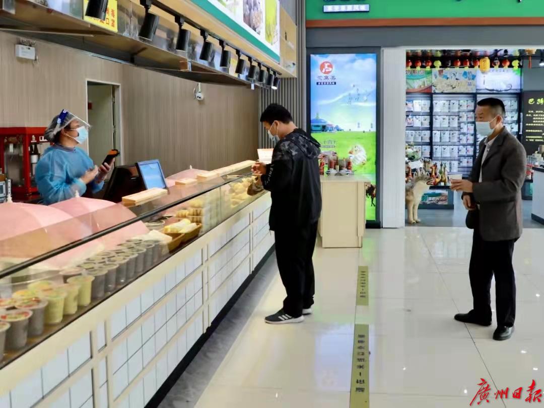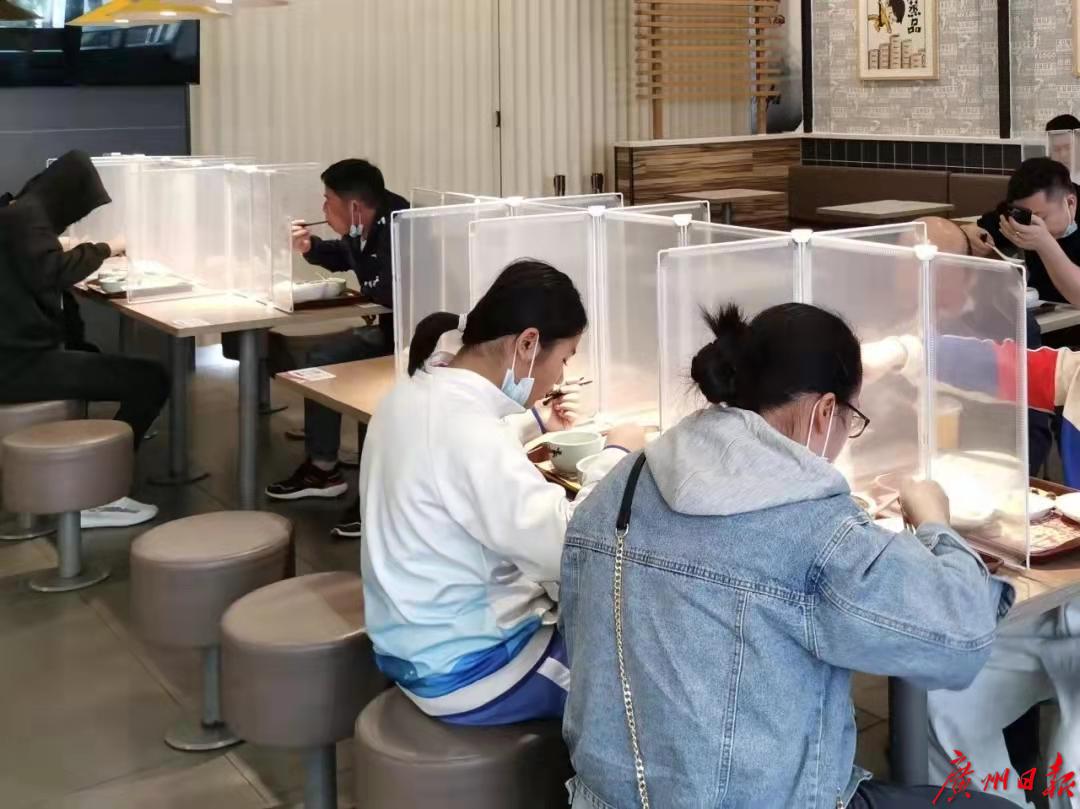 在服务楼内用餐区设置餐桌隔离板,堂食顾客除用餐时取下口罩外,其余时间需全程佩戴口罩,并有专人进行监督提醒。