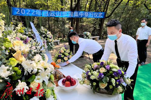 2022年4月4日,白云山思园,工作人员集中祭扫,替不能前来现场拜祭的市民表达缅怀。