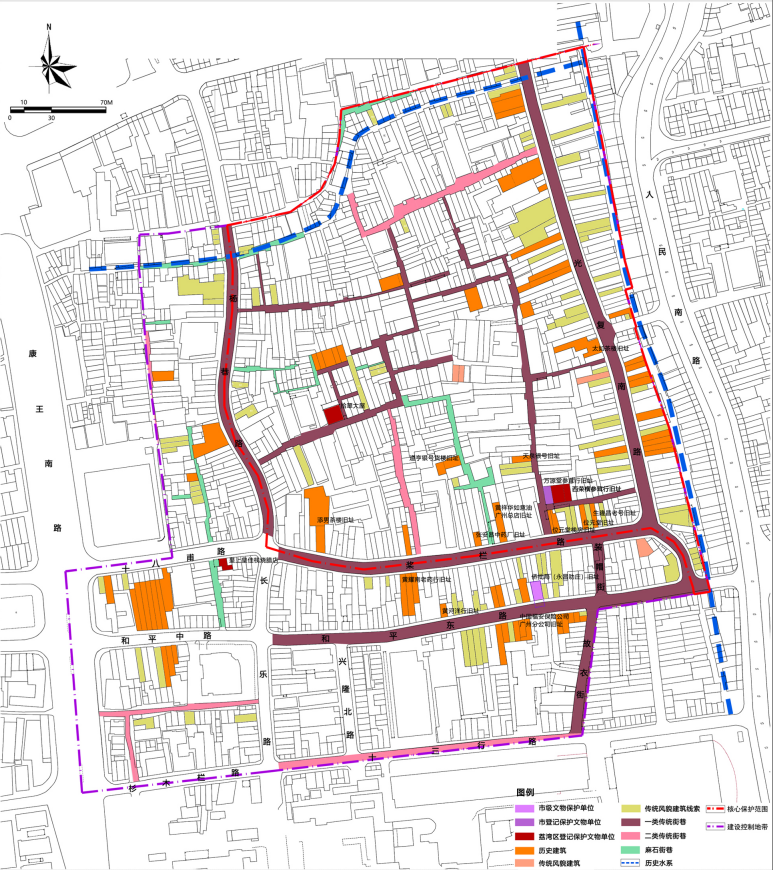 保护控制措施包括,核心保护范围内,文物保护单位、历史建筑、传统风貌建筑严格按照相关法律法规要求进行保护和修缮。除建设必要基础设施和公益性公共服务设施外,不得进行新建,扩建活动。新建或扩建必要基础设施和公益性公共服务设施的,建筑高度应控制在12米以下,在体量、色彩,材质等方面应与街区历史风貌相协调,不得改变街区传统格局和历史风貌。进行修缮和危房原址重建活动,不得增加具有合法产权的原有房屋的建筑高度,在体量、色彩、材质等方面应与街区历史风貌协调,不得改变街区传统格局和历史风貌。