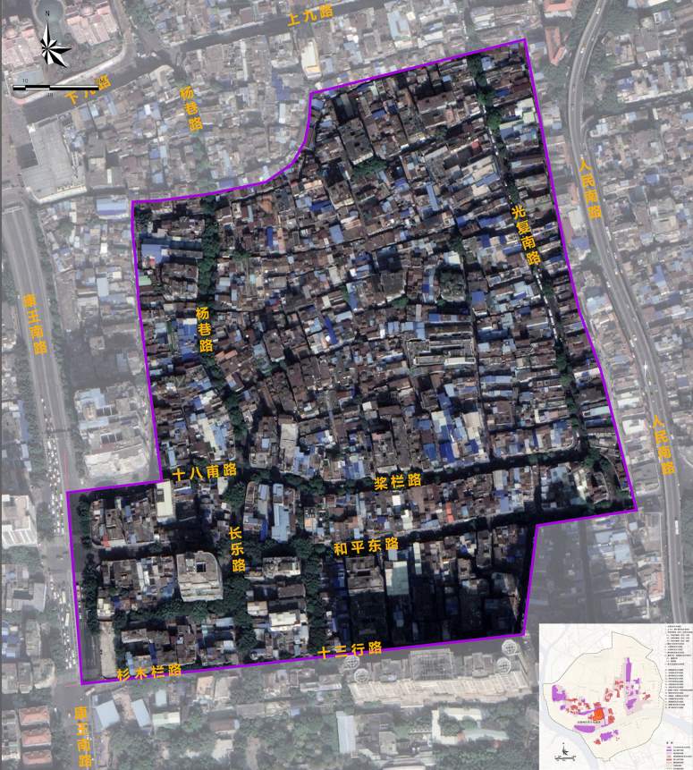 物质性要素包括:街区总体格局与肌理;传统街巷和风貌地段,保护杨巷路、光复南路、桨栏路等一类、 二类传统街巷沿街商铺整体风貌、街巷界面;不可移动文化遗产,包括市级文物保护单位1处,市登记保护文物单位1处,区登记保护文物单位3处,历史建筑51处,传统风貌建筑3处和传统风貌建筑线索94处。