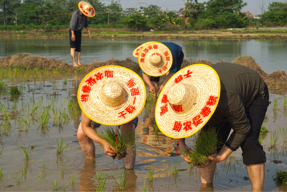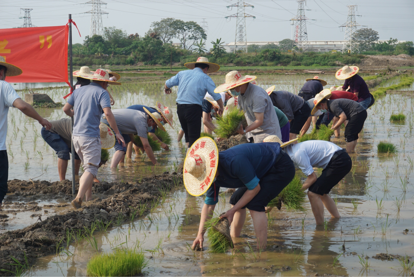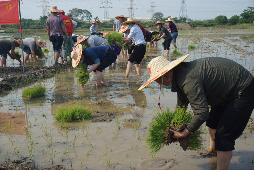 正值农忙时分,活动现场周边的两上村农民群众也纷纷忙于耕种自家的田地。清明前后,白云区江高镇陆续开始水稻的播种工作,种植户一边抓好疫情防控,田间地头一派热火朝天的景象。在活动现场,有资深水稻种植群众为大家讲解播种水稻、插种秧苗的技术技巧、经验经历,干部群众边听边学边做,遇到不懂主动请教、互动交流,齐心协力进行插种水稻秧苗。区镇村党员干部主动深入群众,与群众打成一片、干在一起,在劳动中体会到耕作不易,也体会到劳动的实践快乐,不仅更加密切了干群的鱼水关系,也教育大家反对铺张浪费,对保障粮食安全有更加强烈的共情。
