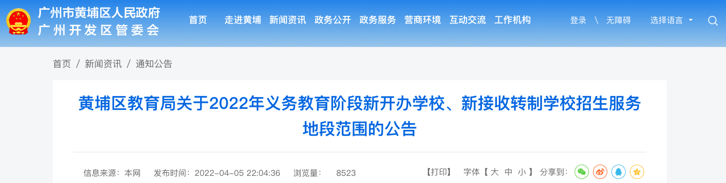 4月5日晚,黄埔区教育局发布关于2022年义务教育阶段新开办学校、新接收转制学校招生服务地段范围的公告。
