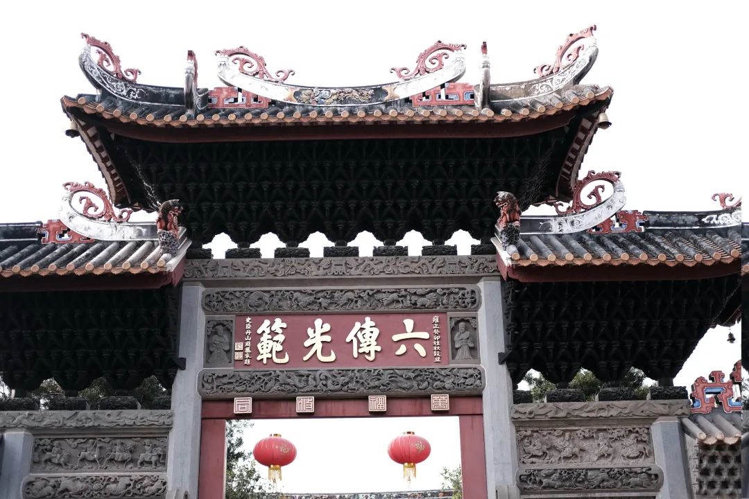 二进仪门由白砂岩石砌筑,明间横匾前刻潮阳进士周凤来题写的“六传光范”,上款“雍正癸卯桂秋谷旦”(即雍正元年八月天清气的日子,也就是善世堂重建竣工的当年),下款为“史臣丹山周凤来题”、印章“仪园”、“周凤来印”;背面刻“星聚一庭”,庭字的写法较为特别,“廴”在外,而“广”字头在“壬”字之上。“六传”是指六世祖陈道明,两句含义为:希望后人以先祖为榜样,能有更多有作为的子孙在此光宗耀祖。
