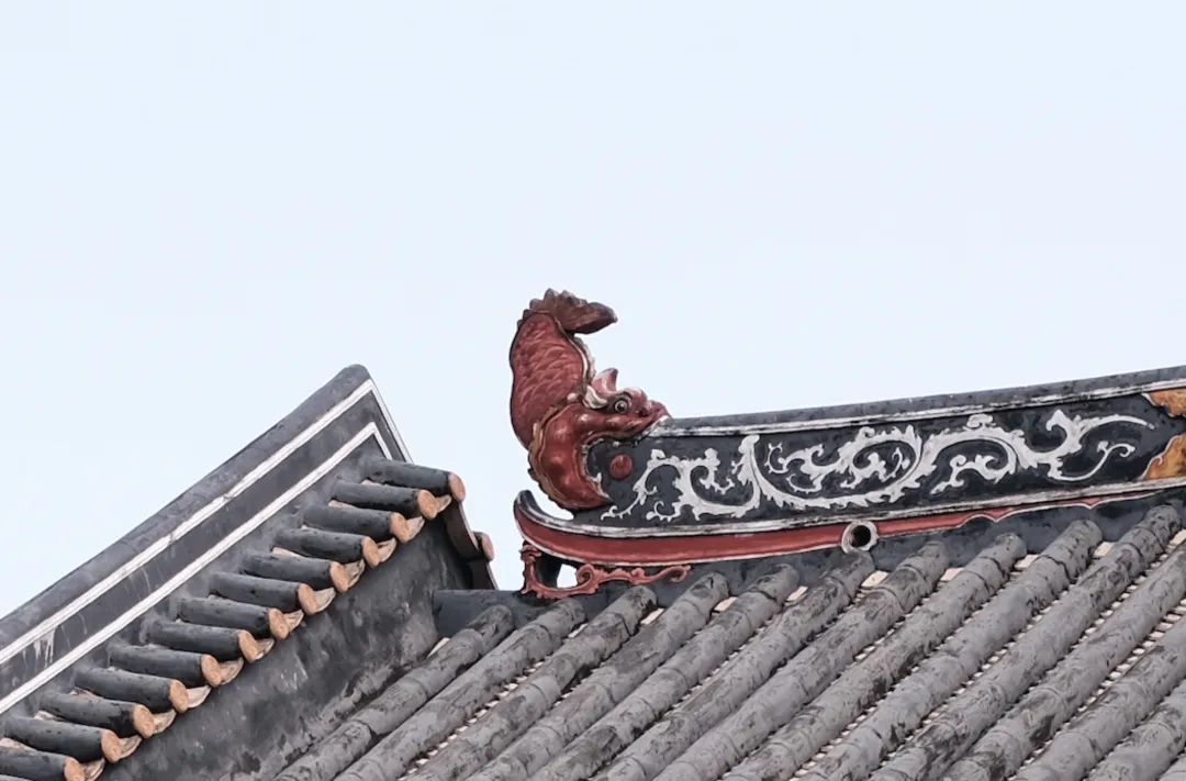 正堂由石檐柱和东京木金柱撑顶,内部梁架木构件通体雕饰,两次间前墙镶嵌砖雕花窗。正中悬挂“善世堂”贴金木匾,这块匾是在清乾隆年间重修时,按原明代抗倭名将戚继光题书真迹复刻。堂内挂有对联:里党贵能和,和气好同春气好;乡闾祈向善,善人多自吉人多。