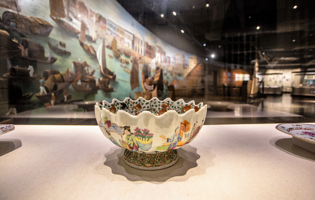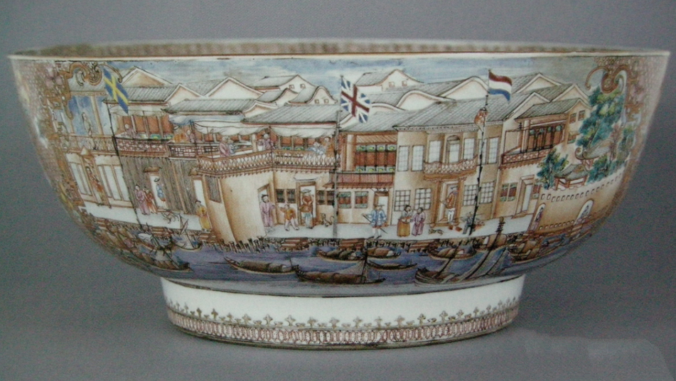 海纳百川、兼容并蓄的广彩匠师,对于一切能够引发市场反响的风格和技法,都不吝于大胆尝试。在琳琅满目的广彩制品中,有一类产品非常特别,称为“行碗”,现又称为“皮碗”,也有人以英文音译称其为“潘趣碗”。这是因为洋人常要求艺师在碗身画上他们与中国人做买卖的地方——十三行的景色,去满足国外消费者的好奇心(见下图)。这种巨型大碗,有些直径甚至达50多厘米,胎薄釉润,图案繁复精美,是广彩外销瓷中的珍品。