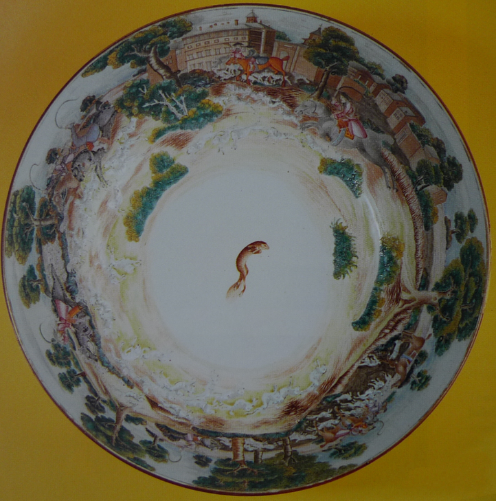 闻名欧洲的广彩文物珍品《猎狐纹调酒大碗》,直径达40.4厘米。碗内壁一圈满画着一幅西洋人猎狐全景图(见下图)。图中贵族们正策马飞驰,一只跳跃奔跑的狐狸绘在碗底中间,这是模仿一幅油画绘成的。但是图中所采用的环形散点透视法跟中国长卷画的散点透视法是出于一样的原理。由此可见,碗里美丽完满的图案,是广彩的加彩高手经过对原画构图的再创作绘制而成的。(文/广州日报特约作者曾应枫、李焕真)