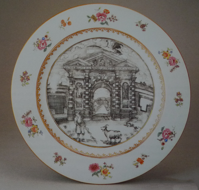 约在1765年,广彩匠师制作过一件描绘英国牛津波塔尼卡尔公园大门的瓷盘,门前站着和山羊一起散步的德国植物学家波巴尔脱(见下图)。这是荷兰铜版画家伯尔格赫尔斯的作品,由牛津的青年博物学家布莱克带到广州,请广彩匠师复制到瓷盘上。由此可知,当时的“上手”师傅(广彩高级加彩工艺师)以工笔模仿西洋铜版画,工艺已臻极致。