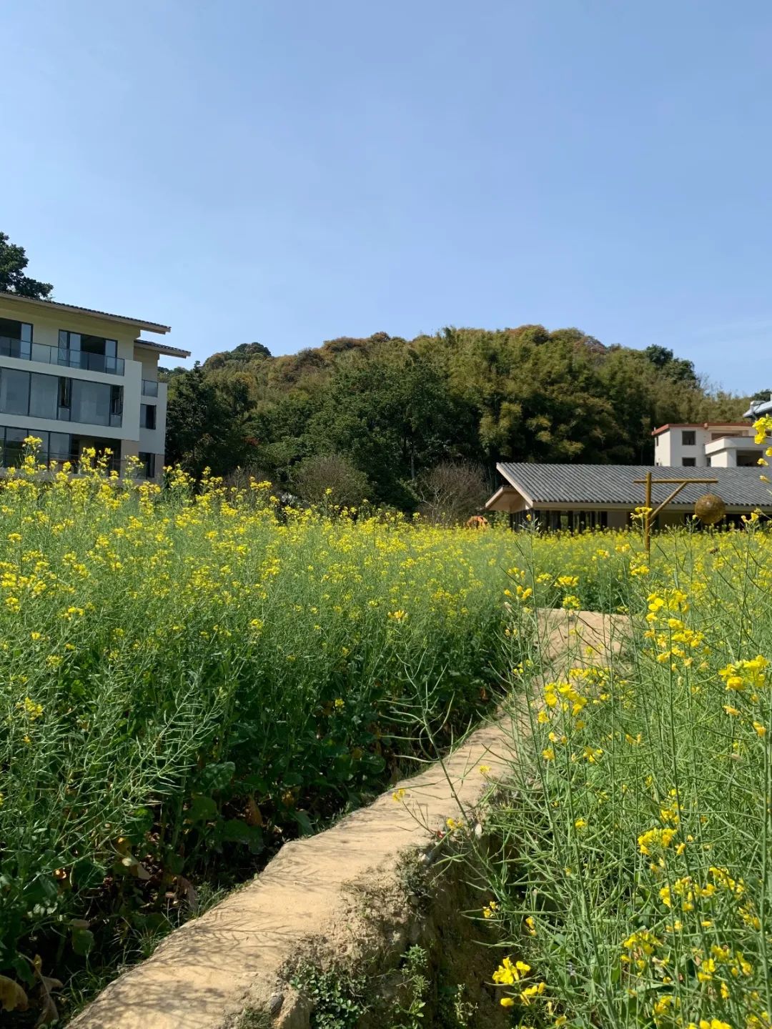 在该民宿前方,一片茂密的油菜花花香四溢,引来蜂飞蝶舞。当地村民介绍,这片田地轮种油菜花和水稻,一年四季均有风景可欣赏。从云山秋月附近的八哥奈野花园继续前行,到达路边护栏尽头后进山,还观赏到盛开的禾雀花。