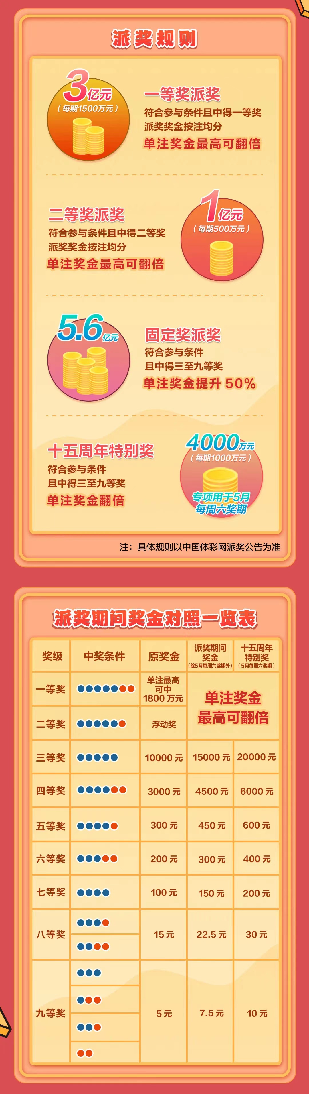 固定奖派奖奖金5.6亿元。派奖期间,符合参与条件且中得三至九等奖中任意奖级的彩票,同时中得派奖奖金,单注派奖奖金为当期对应奖级单注奖金的50%,若5.6亿元派完,则固定奖派奖于当期派奖后结束,当期派奖奖金不足部分由超级大乐透调节基金补足。