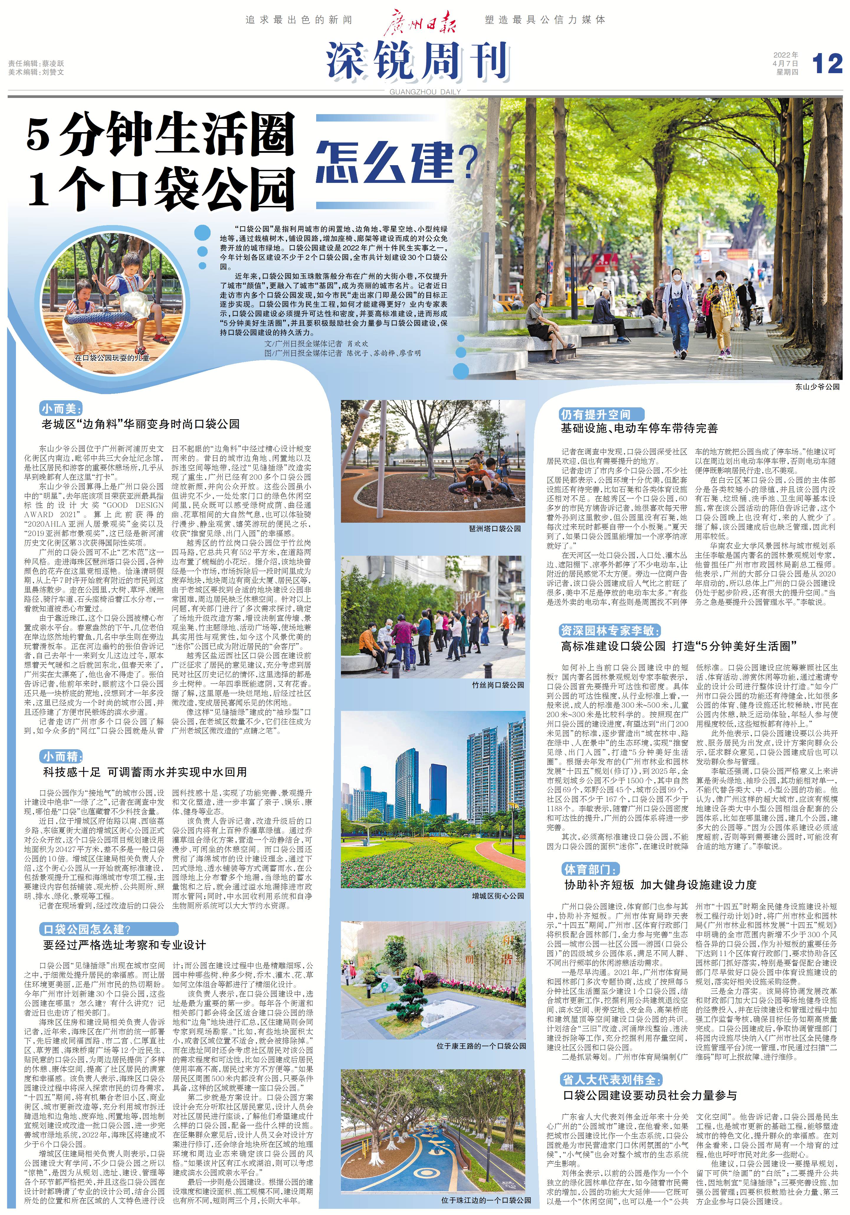 近年来,口袋公园如玉珠散落般分布在广州的大街小巷,不仅提升了城市“颜值”,更融入了城市“基因”,成为亮丽的城市名片。记者近日走访市内多个口袋公园发现,如今市民“走出家门即是公园”的目标正逐步实现。口袋公园作为民生工程,如何才能建得更好?业内专家表示,口袋公园建设必须提升可达性和密度,并要高标准建设,进而形成“5分钟美好生活圈”,并且要积极鼓励社会力量参与口袋公园建设,保持口袋公园建设的持久活力。
