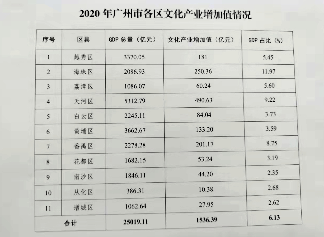 2020年广州市文化产业增加值统计数据也在大会上发布。截至2020年,广州市文化产业增加值达到了1536.39亿元;GDP占比为6.13%。其中,GDP占比最高的区为海珠区,增加值为250.36亿元,GDP占比为11.97%;文化产业增加值最多的为天河区,达490.63亿元,GDP占比为9.22%。
