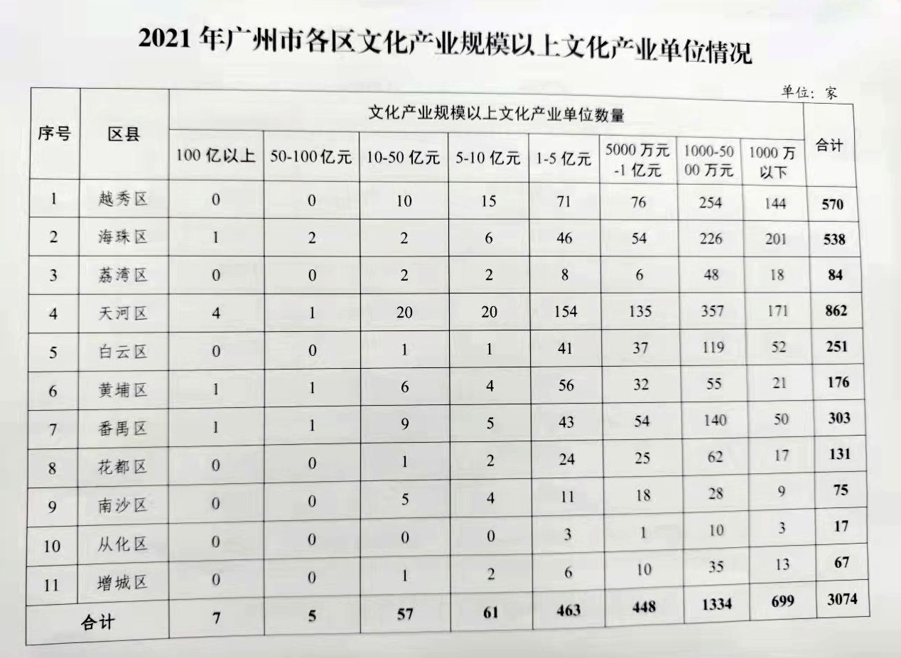 记者在现场了解到,截至2021年,广州市11区文化产业规模以上文化企业单位数量增至3074个。其中100亿以上规模文化企业7家;50亿-100亿规模文化企业5家;10亿-50亿规模文化企业57家。就各区文化产业发展情况而言,100亿以上规模文化企业数量天河居首,达4家;海珠区、黄浦区及番禺区各一家。