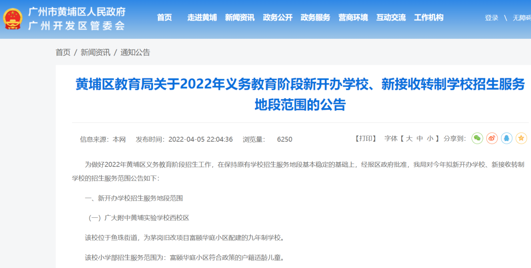 为做好2022年黄埔区义务教育阶段招生工作,在保持原有学校招生服务地段基本稳定的基础上,经报区政府批准,我局对今年拟新开办学校、新接收转制学校的招生服务范围公告如下: