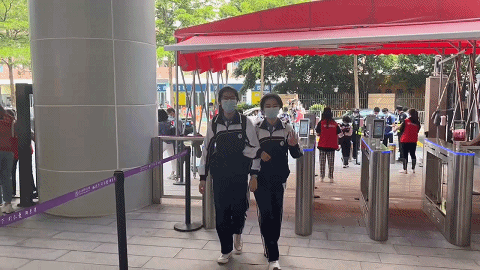 学校实行严格的入校核验,工作人员对照“白名单”逐一检查返校师生员工的 24 小时核酸检测阴性证明、粤康码绿码、行程卡、健康信息申报卡等信息之后放行。学生按照指定路线排队有序入校,在测温卡点检测体温,入校后立即洗手消毒。