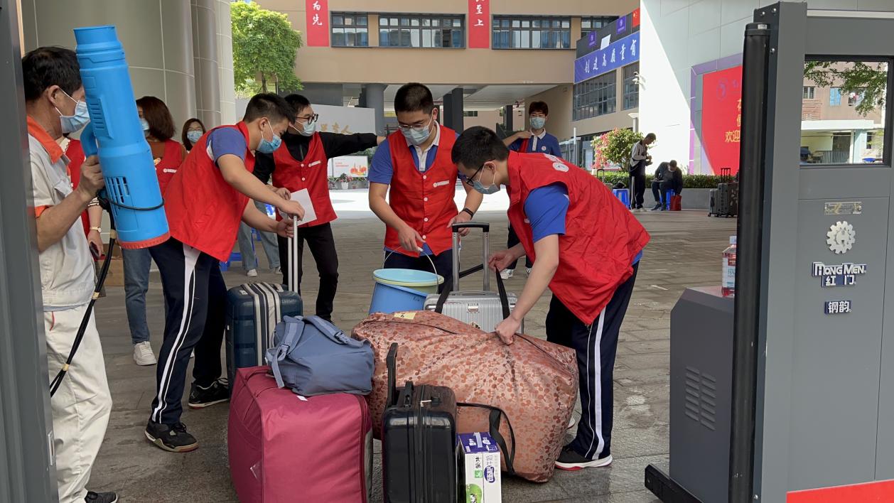 从早上开始,学生义工和教师志愿者早早守候在学校门口,等待同学们归来。教师、学生志愿者化身“搬运工”,站在校门口热心地迎接学生,帮助搬运行李。送学生返校的私家车一到校门口,“红马甲”“蓝马甲”打开后备厢,扛起行李箱,走物资通道运到消杀处消毒,再统一运送到宿舍。在校门口、教学楼、宿舍楼等地点都有志愿者忙碌的身影,以确保返校学生能得到及时的帮助。