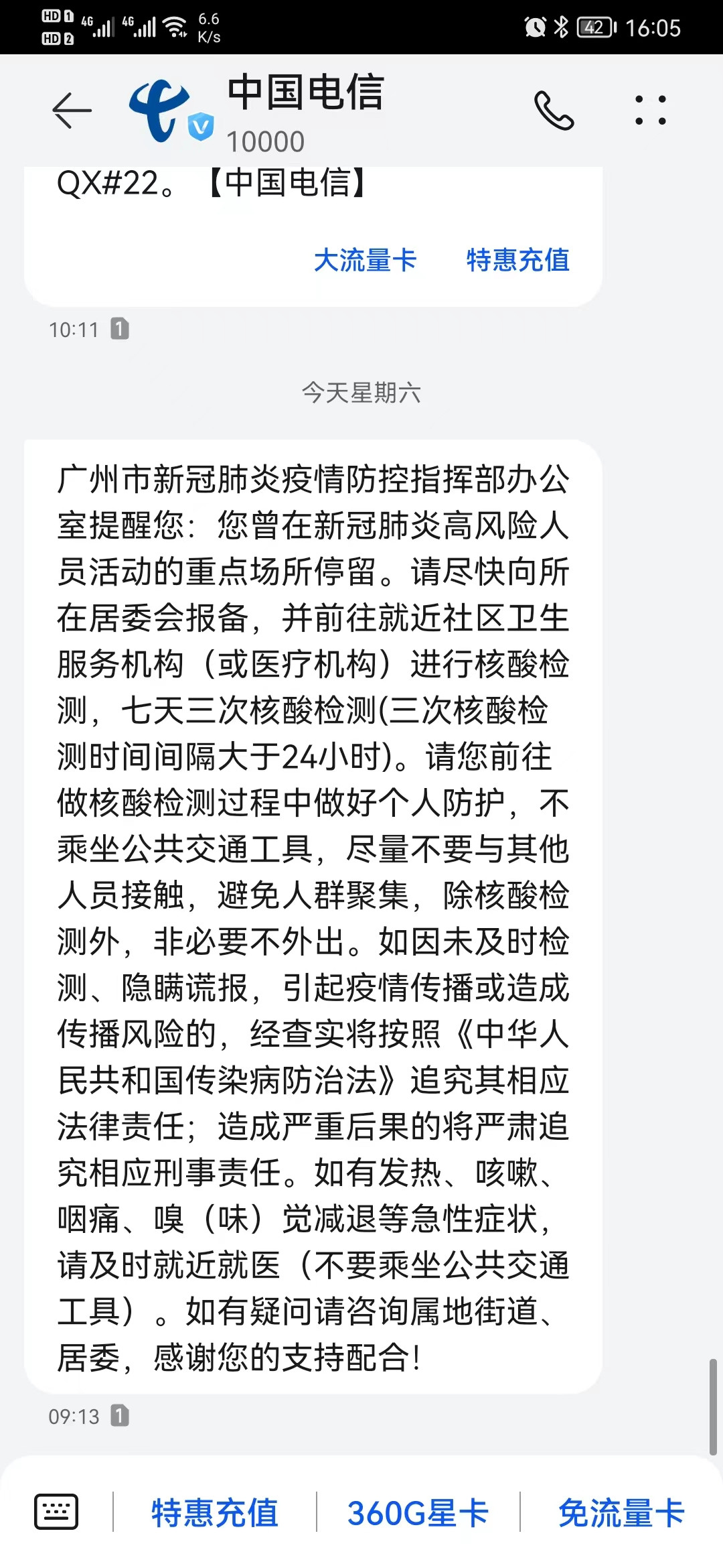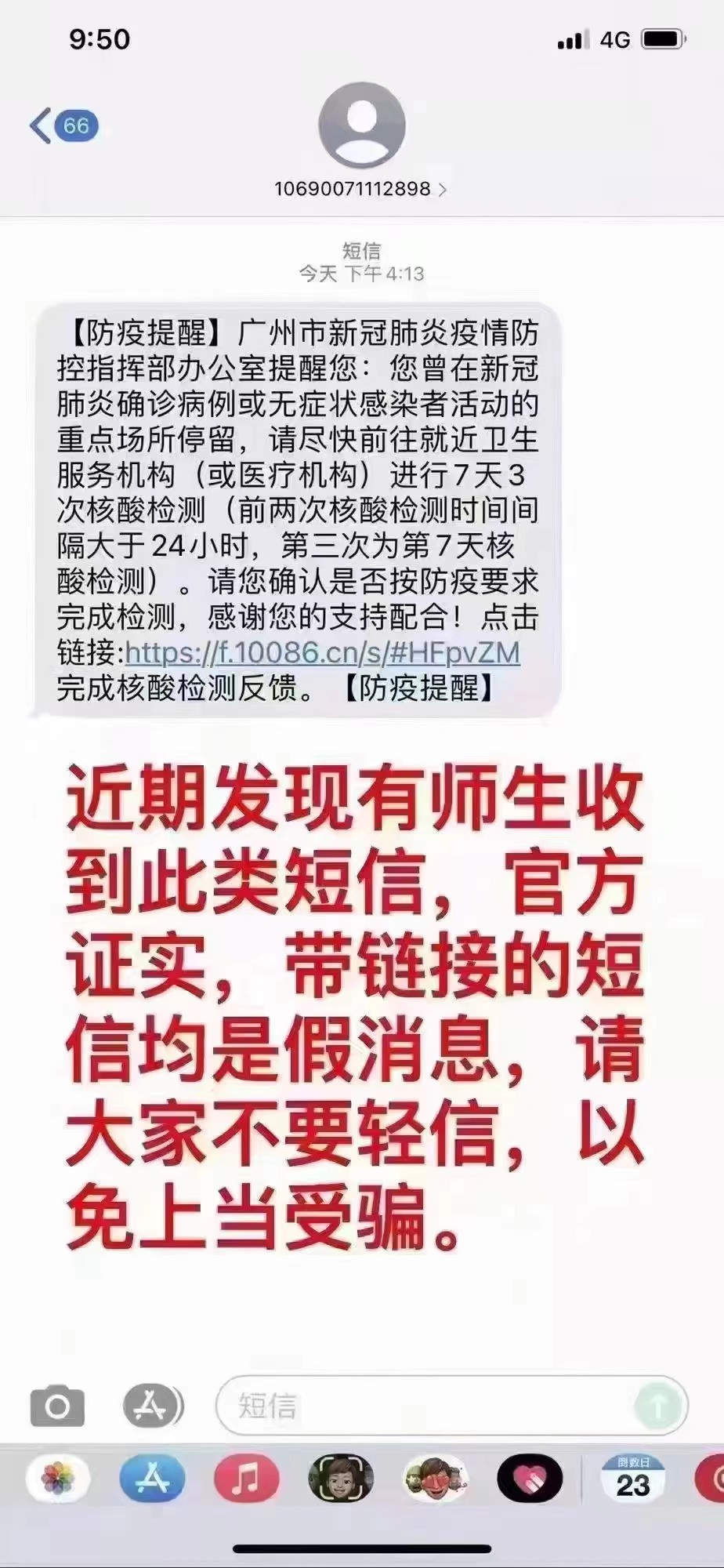 最后,再次提醒广大市民,收到防疫短信后,注意识别短信端口,广州移动防疫短信端口为10086或10657开头,5G信息为12520开头;广州电信防疫短信端口为10000;广州联通发送防疫类短信的端口有:10010、10655开头的短号以及1237902。如不是上述三大运营商短信端口,不要点击短信附有链接,以免上当受骗。