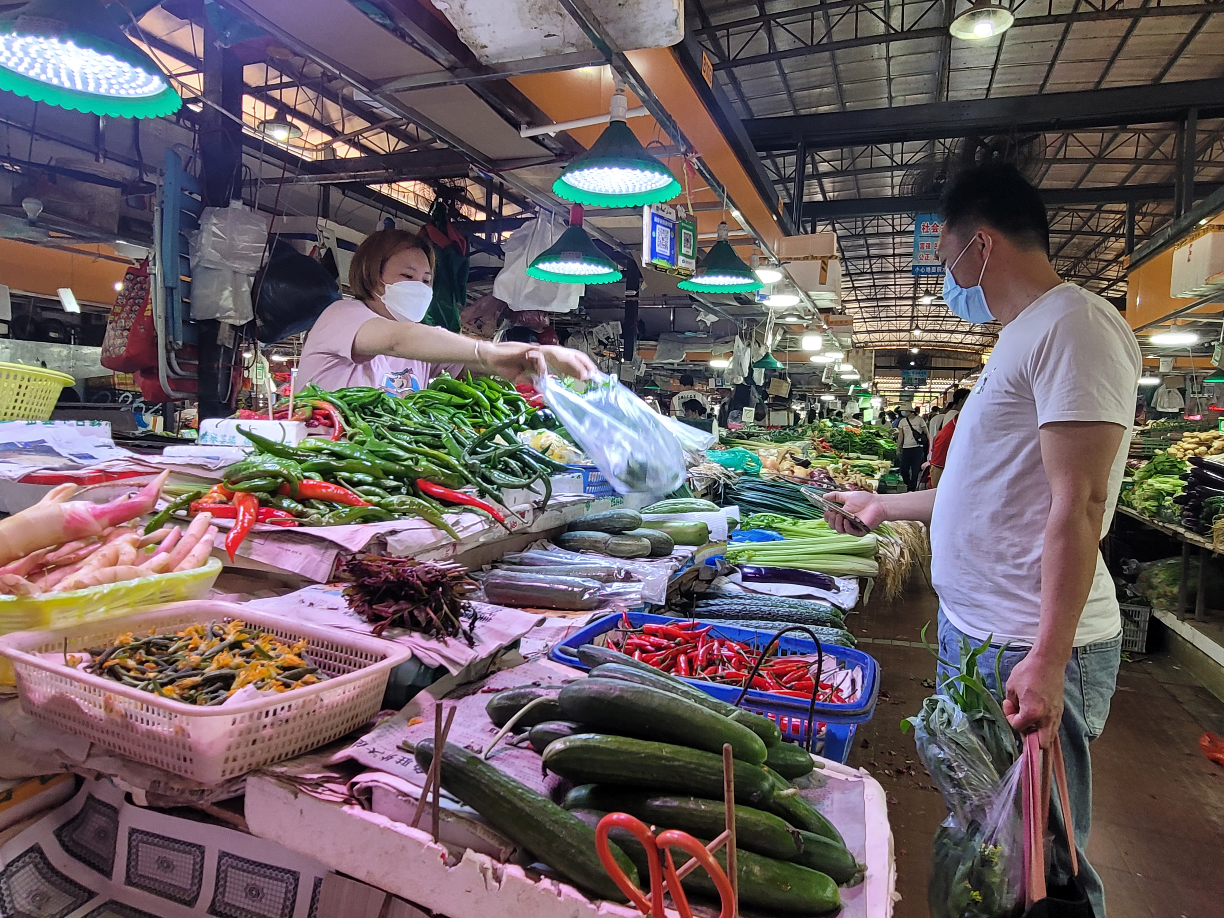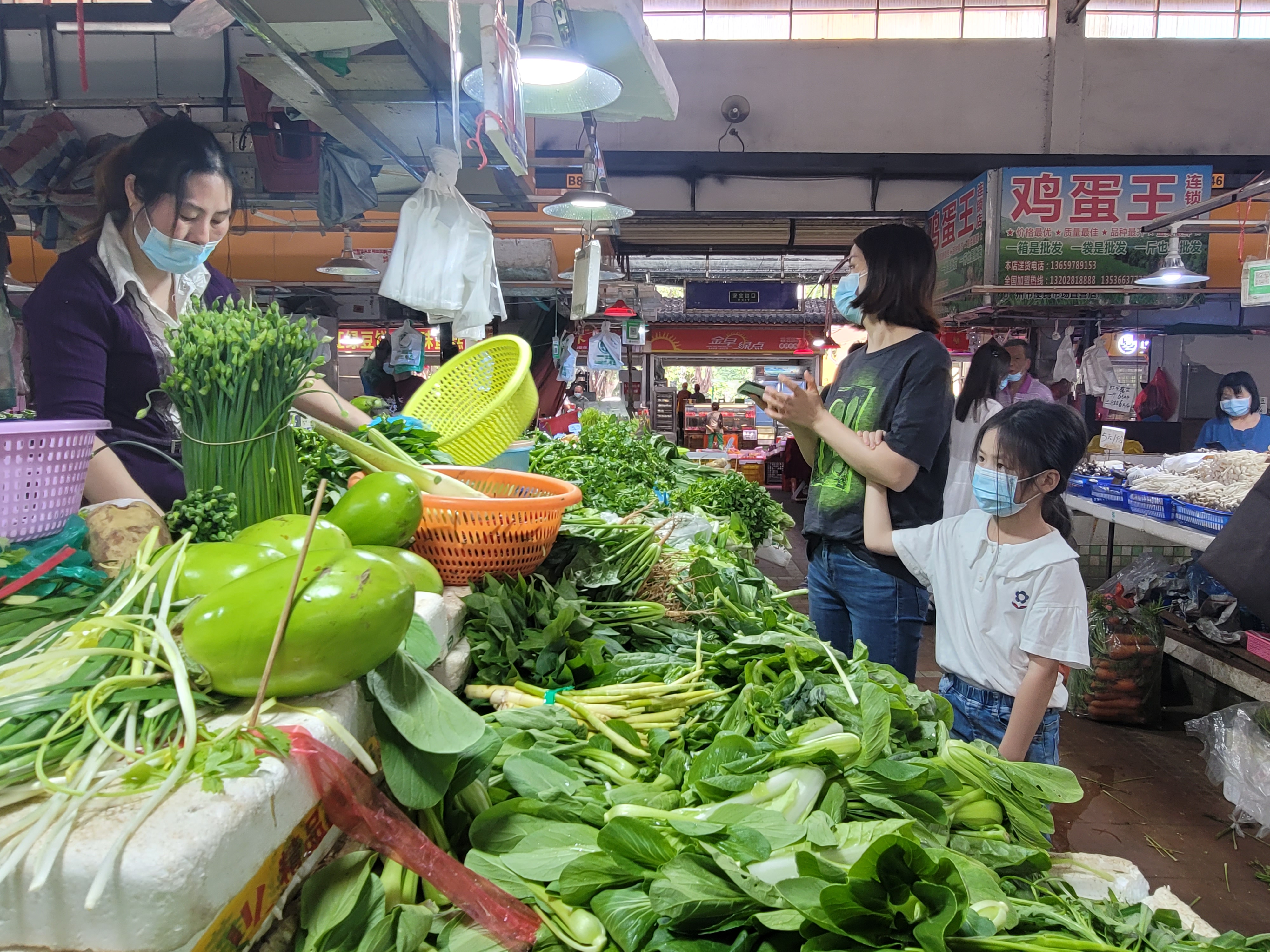 记者走访部分摊位了解到,蒜头价格在6.5元/斤,菜心12元/斤,油麦菜5元/斤,黄瓜6.5元/斤,清远鸡17元/斤,文昌鸡18元/斤,鸡蛋价格大致在每斤8.5—12元。