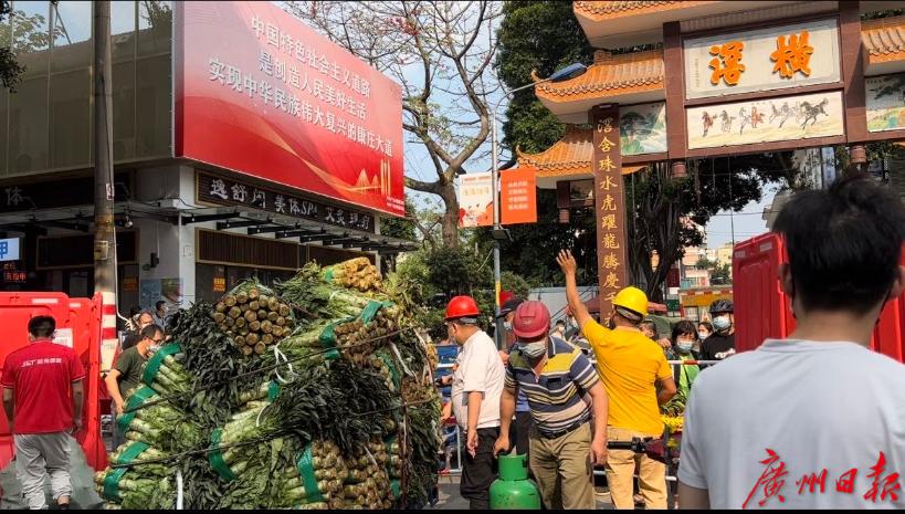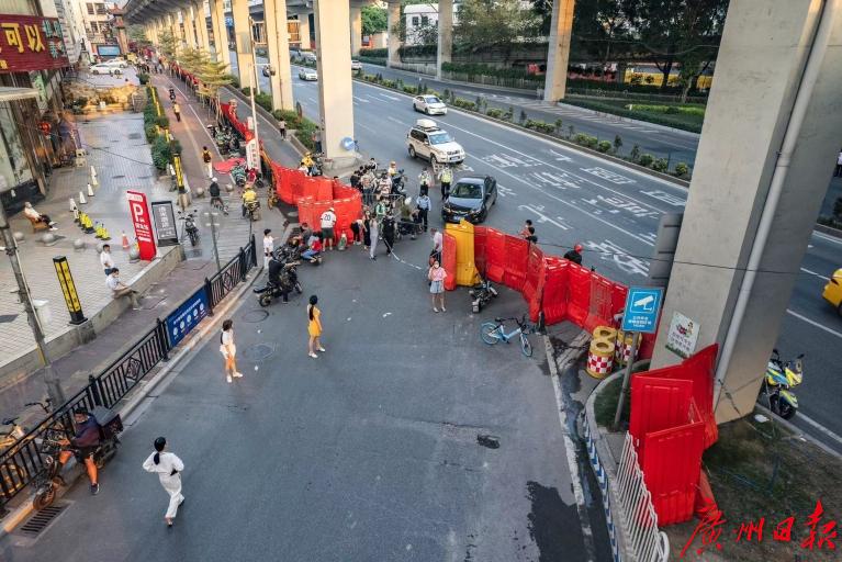 4月9日下午,记者驱车沿广园东路向西前行,看到沿路全部被红色水马围蔽,在三元里松柏新村牌坊附近,有工作人员还在巡查加固围蔽设施。