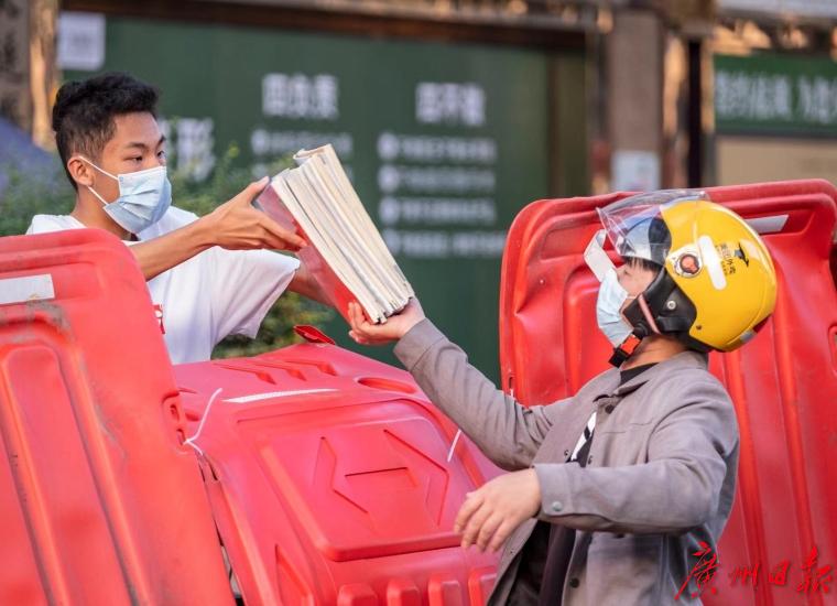 从广园中路行至机场路18号,设置了一个卡口。不少管控区内的市民群众来到卡口拿取外卖、快递,或交接亲友送来的物资。管控区内有企业工作人员将一平板推车的面膜运到卡口,管控区外的伙计将一一箱箱面膜搬上小面包车,称“要尽量把客人下单的货发走”。