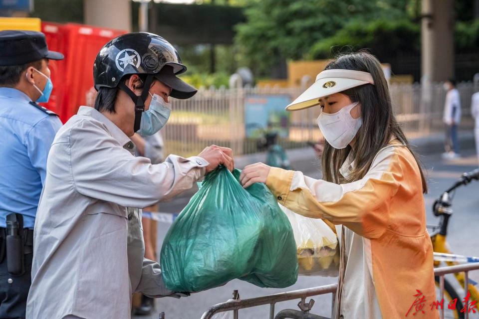 大量的货品交接在西槎路横滘牌坊的卡口处进行。记者现场看到,送货人员把一车车蔬菜瓜豆,水果、蛋品,米面、冷冻家禽家畜肉品、饮用水、饮料等物资送到卡口,品种丰富。