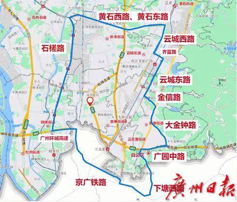 位于白云区的管控区为:黄石西路—黄石东路—云城西路—齐富路—云城东路—金信路—大金钟路—广园中路—下塘西路—童心路—京广铁路—环城高速—西槎路—石槎路区域,实行“足不出区,错峰取物”管理措施。