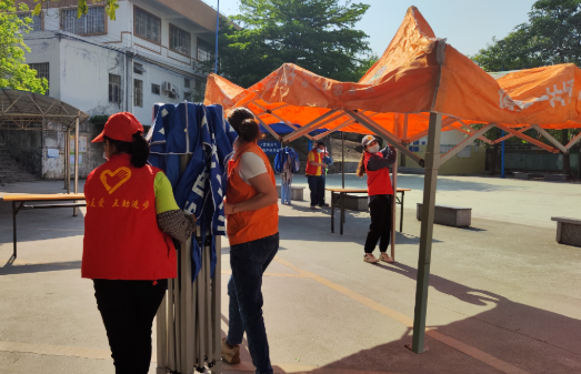 早上7时,在花都区街各镇街核酸检测现场,工作人员群策群力,有序搭帐篷、摆桌椅、贴指引牌、设置围栏、拉警戒线、设置一米线等,为核酸检测工作做好准备。