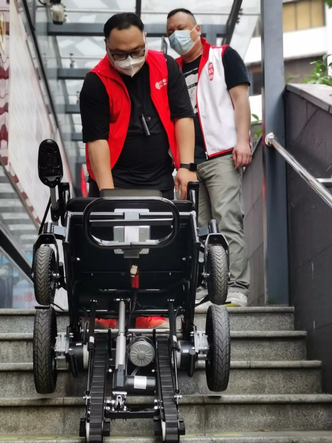 伍姨在工作人员的搀扶下坐上电动轮椅,工作人员为其仔细系好安全带,再小心操作轮椅,轮椅则平平稳稳地“上下楼梯”。