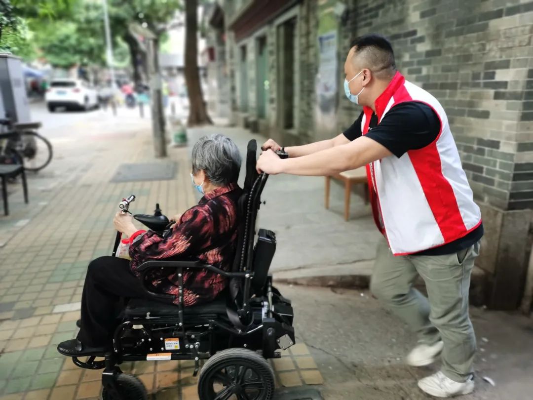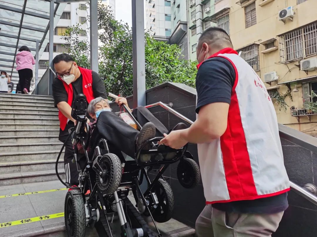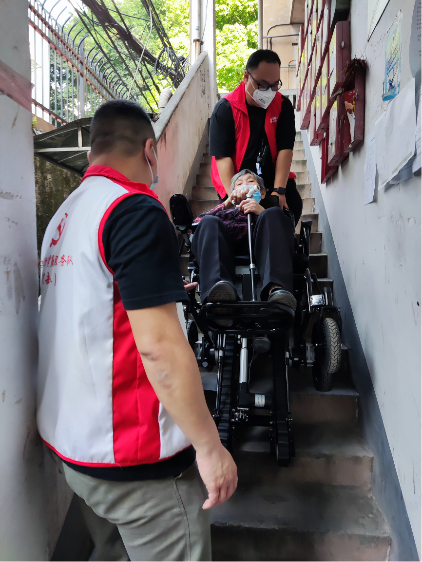 家住5楼的伍姨想要下楼接种新冠疫苗,却因为腿脚不便而不方便下楼。得知这一情况后,建设街联合广东善缘社会工作服务中心为长者们带来了“爬楼神器”——可以自动上下楼的轮椅,让不方便下楼的长者都能轻松地下楼,前往疫苗接种点。