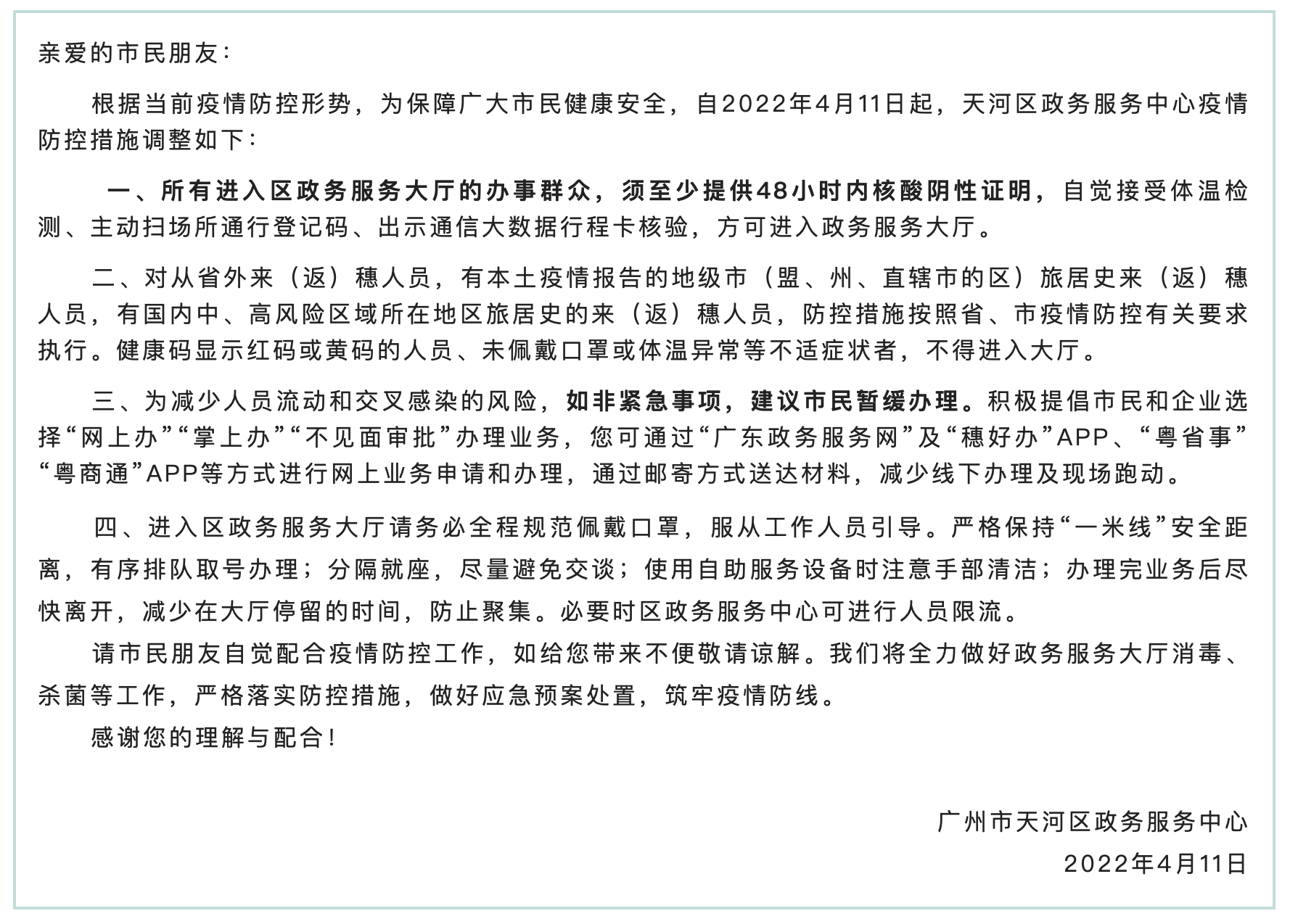 今日(4月11日),记者了解到,根据当前疫情防控形势,为保障广大市民健康安全,自2022年4月11日起,天河区政务服务中心疫情防控措施调整如下: